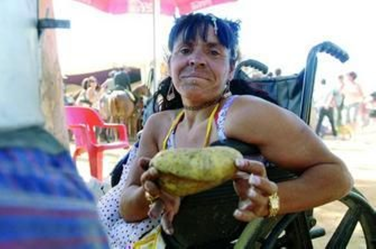 Sentada en su silla de ruedas, prepara todos los avíos necesarios para preparar patatas asadas. Ella y su hija viven la feria de otra manera. "Yo y mi hija estamos allí de 3 de la tarde a 5 de la mañana", cuenta la mujer. Antonia tiene nueve almas que alimentar y asegura que el estar parada es su mayor problema. "La crisis se nota hasta en la feria... la gente no compra muchas patatas, en dos días, hemos hecho 200 euros". La mujer explica que quizás su recaudación aumentaría si le dejaran vender tabaco. "La gente pregunta si vendemos tabaco, pero está prohibido y si vendes la policía te lo quita".