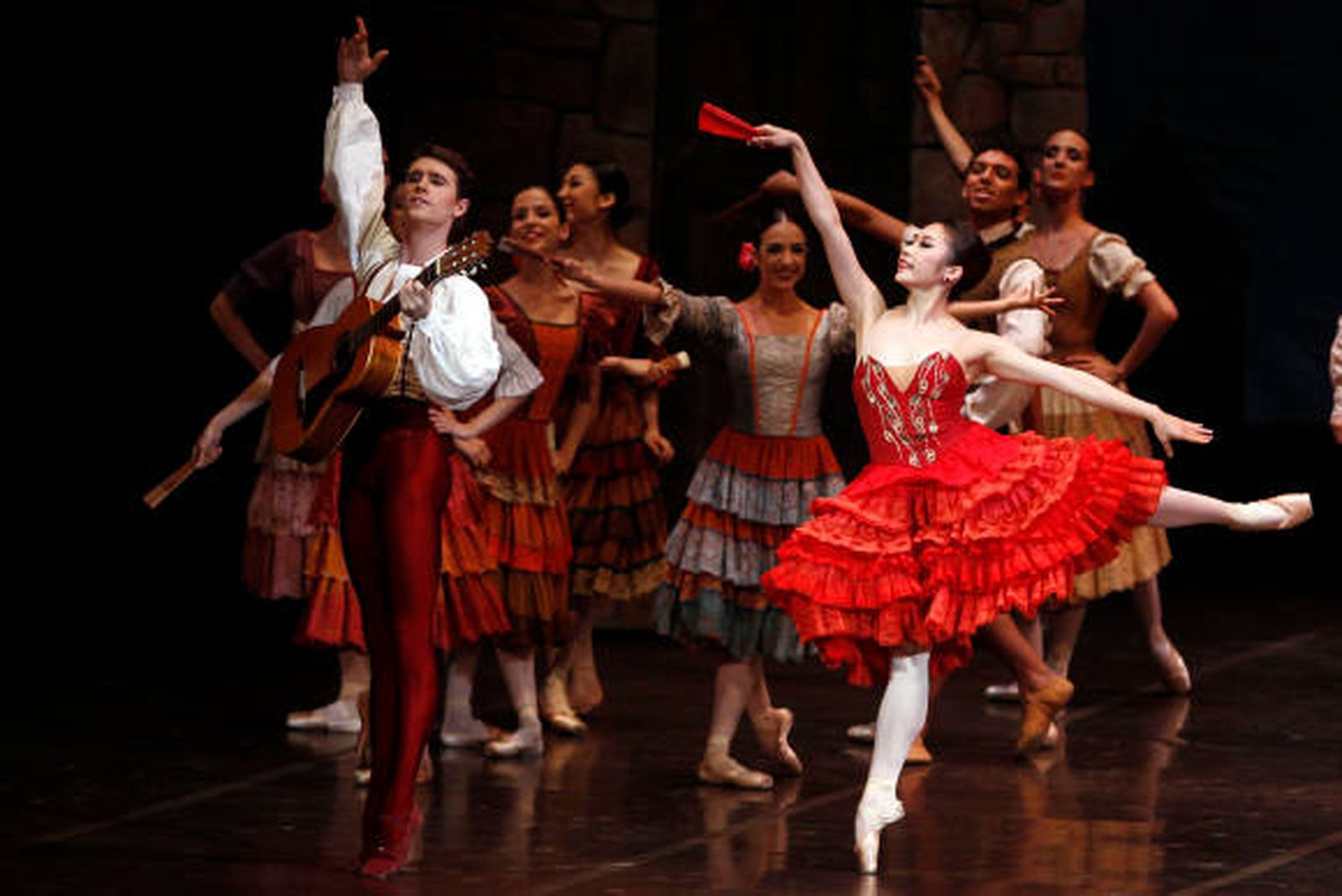 Pudimos ver las evoluciones del romance entre los jóvenes Basilio y Quiteria, y sufrir con los mil y un contratiempos que surgían a la pareja. El cuerpo de baile, perfectamente sincronizado y con una gracia y expresividad muy nuestras, donde no faltaron abanicos y panderetas.