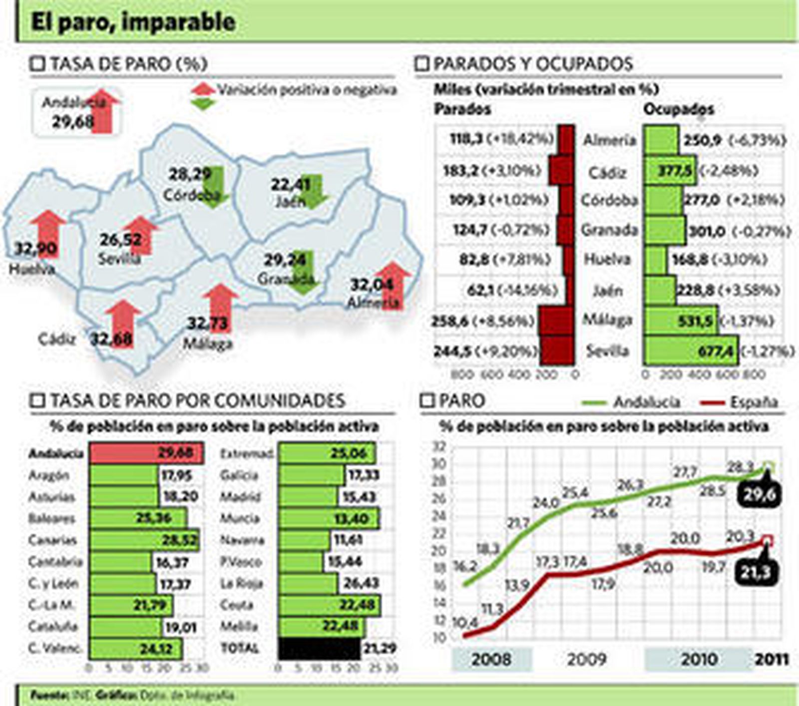 La Encuesta de Población Activa (EPA) relativa al primer trimestre del año no puede ser más desoladora. Es cierto que no se alcanza la barrera psicológica de los cinco millones de parados, pero casi. 4.910.200 desempleados en España, récord histórico en términos absolutos, y 21,29% de tasa de paro, un porcentaje al que no se llegaba desde 1997. Andalucía está a la cabeza en esta triste marca: ya supera ampliamente el millón (1.187.600) y ya ha arrebatado a Canarias el dudoso honor de ser la comunidad autónoma con más tasa de paro. Está prácticamente en la frontera del 30%, con un 29,68% de paro. Y cuatro provincias, además, ya superan esa fatídica barrera, y no por poco [ver gráfico]: Almería, Cádiz, Málaga y Huelva. Sólo Las Palmas, en el resto de España, tiene más del 30% y en cualquier caso, su 31,01% no supera en desempleo a las andaluzas.