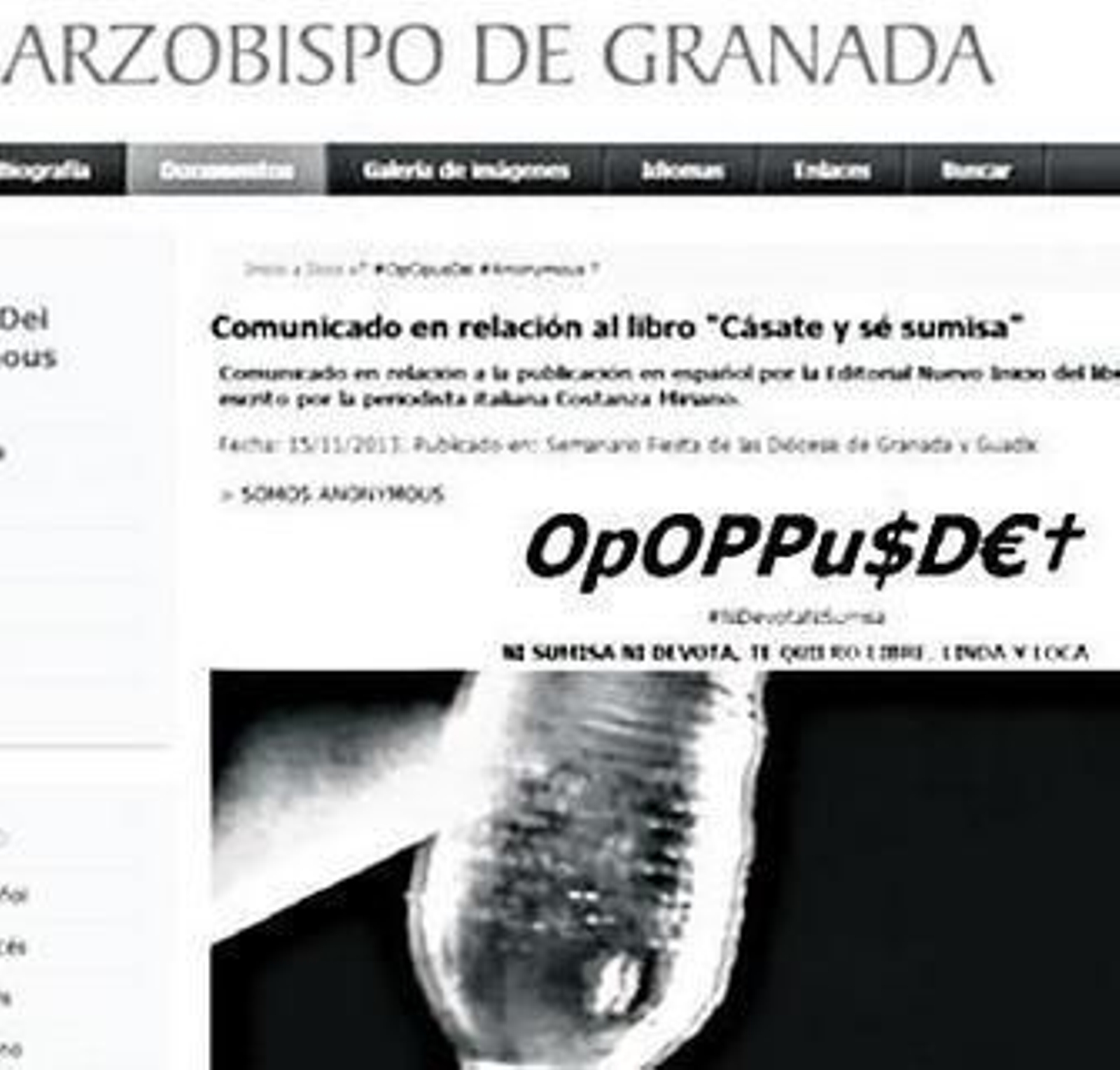 El grupo Anonymous hackeó ayer la página web del arzobispo de Granada, Francisco Javier Martínez (www.arzobispodegranada.es), en protesta por la publicación del libro Cásate y sé sumisa, en una acción que reivindicó en una de sus páginas en internet, dentro de lo que denomina la Operación Opus Dei. El incidente se produjo durante la tarde del domingo y duró unas horas.