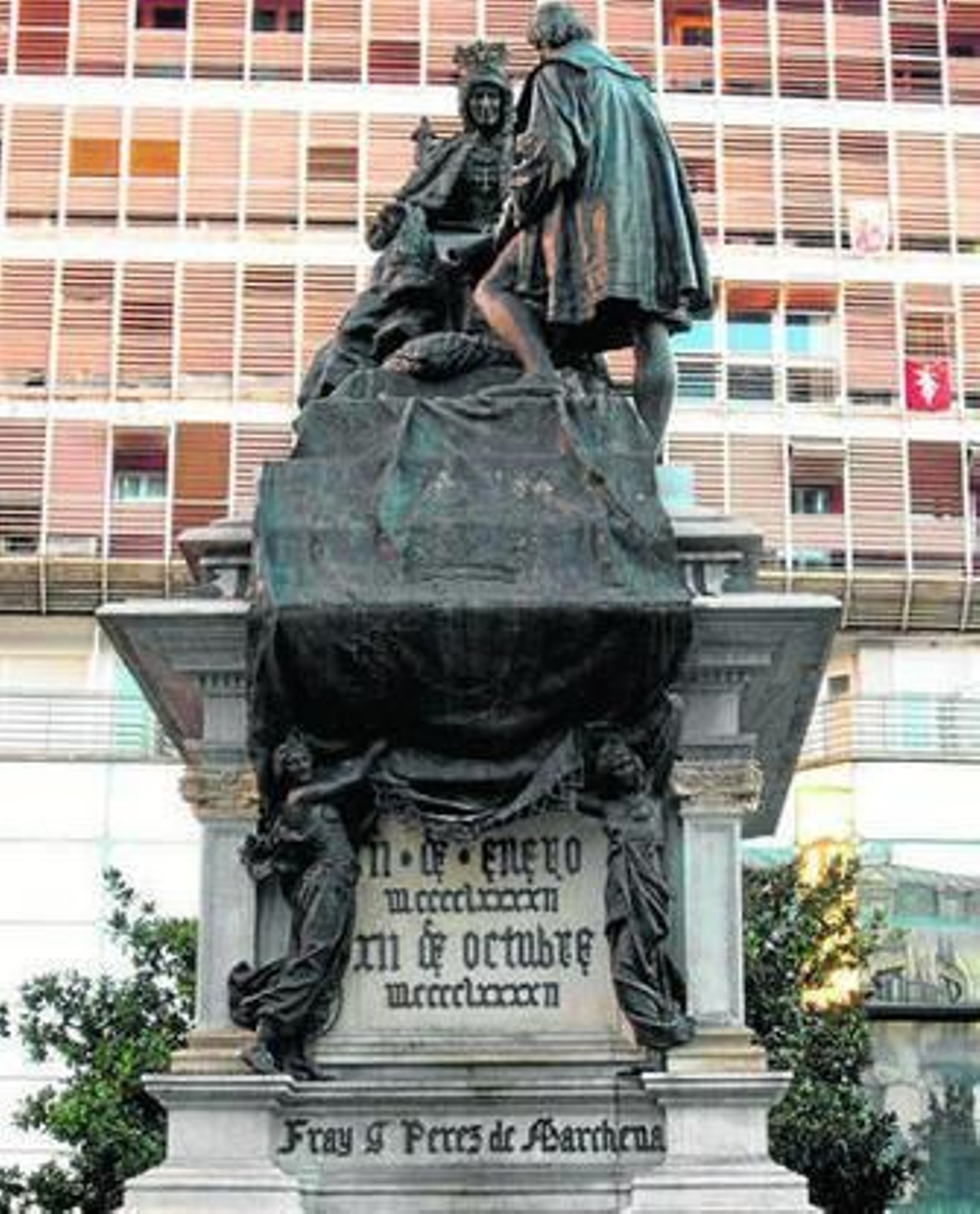 Pero lo más chocante es la confusión de la parte frontal y más visible del pedestal. Se trata de la unión del nombre Fray J. Pérez de Marchena, cuando en realidad fueron dos frailes franciscanos distintos: Fray Juan Pérez y Fray Antonio de Marchena. Personajes decisivos en la aventura colombina. Tal vez Benlliure se informó mal o lo equivocaron las crónicas de Fernández Oviedo y de López de Gómara que unificaron en uno los que eran dos.