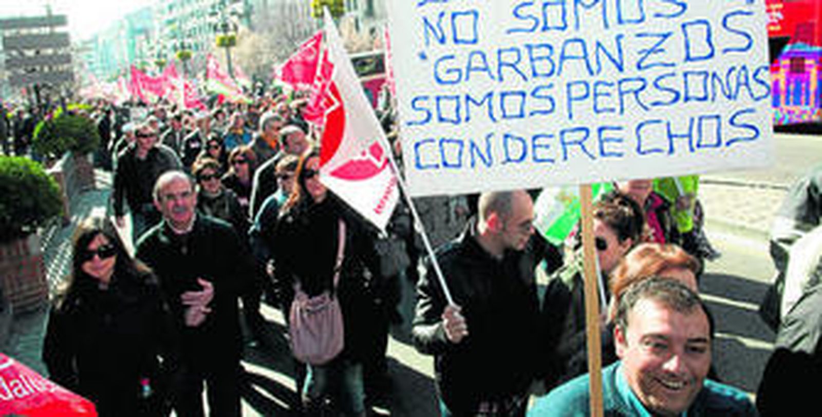 No fue la manifestación festiva que se acostumbra a hacer en fechas señaladas, tipo 1 de mayo. No había batucada (lo cual en cierto modo fue un alivio, porque tanto ruido después de un sábado por la noche no es lo que recomiendan los médicos) y sí muchísimas banderas de los sindicatos. En cuanto a las consignas, se corearon las de costumbre ("Obrero despedido, patrón colgao", por poner un ejemplo) pero también otras dirigidas especialmente al partido que ejerce el Gobierno ("Dónde están, no se ven, los niñatos del PP" o "Te va a votar, te va a votar, te va a votar tu p... madre") y contra el que lo preside.