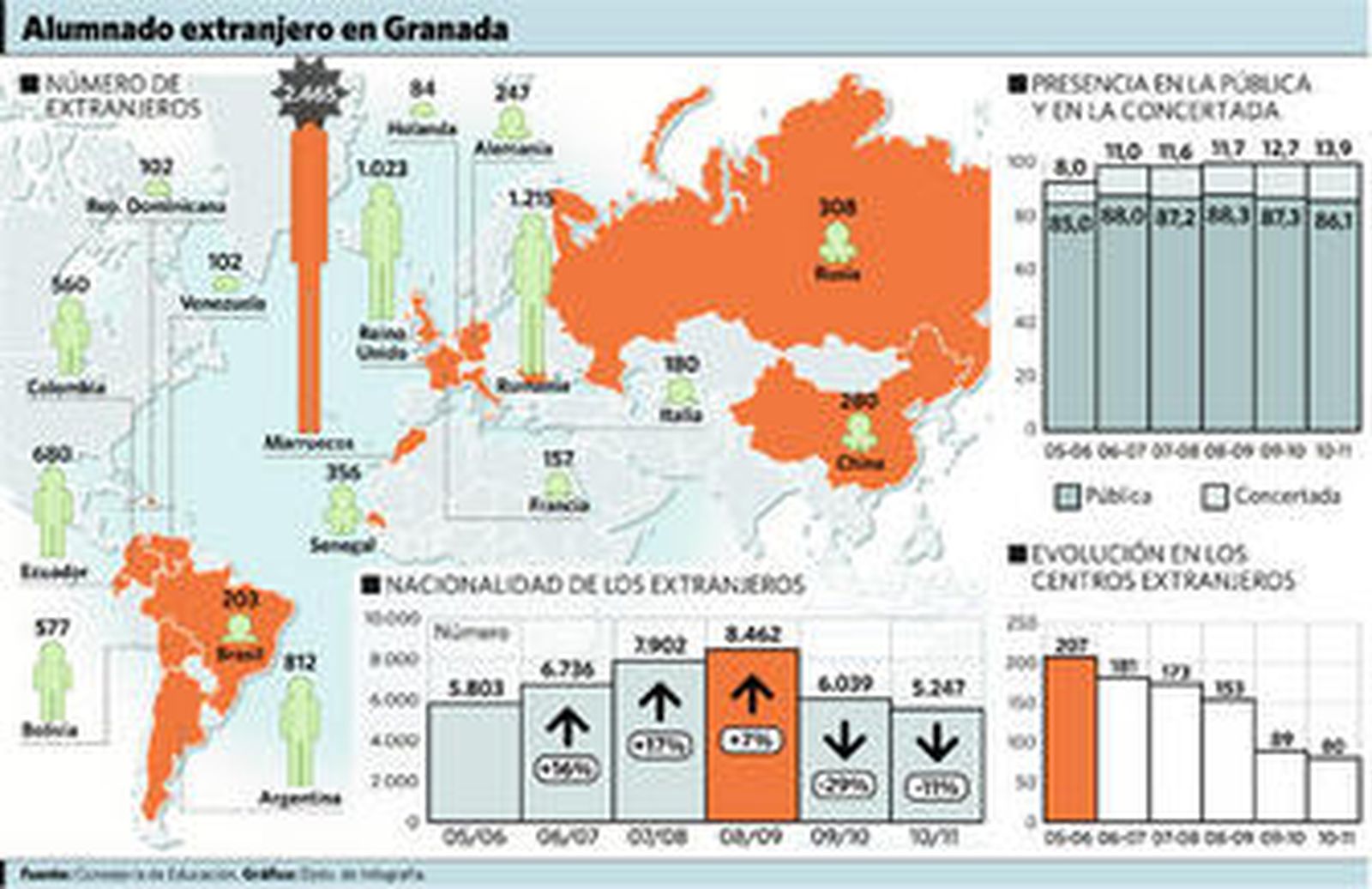 Hasta 116 nacionalidades hay matriculados este curso en las aulas granadinas. El país de procedencia más común es Marruecos, de donde vienen 2.465 alumnos, le sigue Rumanía, con 1.215 estudiantes, y el Reino Unido, con 1.023. De cuatro países llega el grueso de los alumnos sudamericanos: 812 de Argentina, 680 de Ecuador, 577 de Bolivia y 560 de Colombia. Aunque esto no siempre ha sido así, el origen del alumnado extranjero ha fluctuado mucho en el último lustro.
