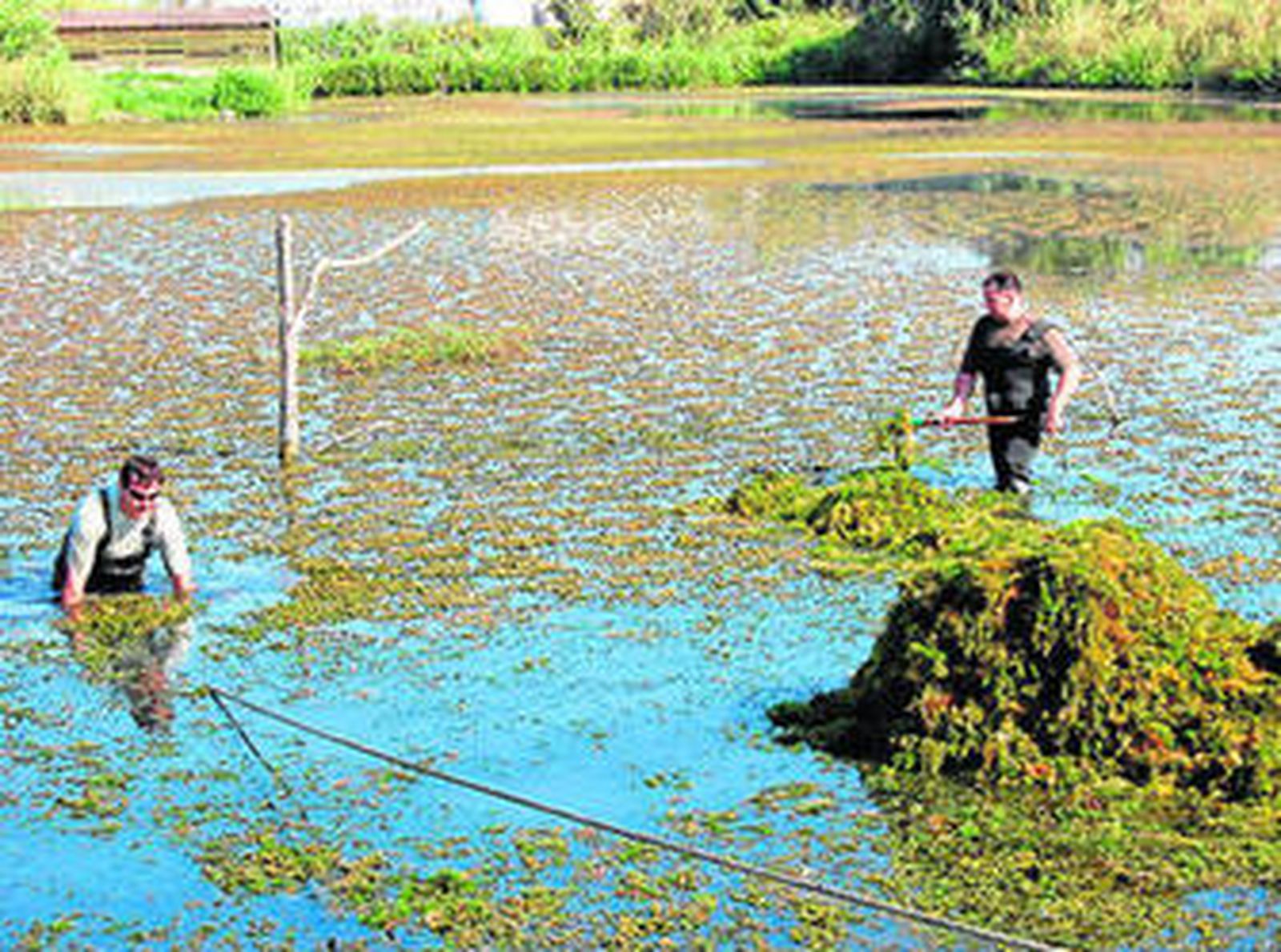 Ataviados con bieldos y rastrillos y metidos en el agua hasta la cintura, se esmeraban en apilar las plantas durante las dos horas que duró la actividad para no molestar a la fauna que reside en este espacio natural, donde hay varios carteles en los que se pide silencio para las distintas especies que allí habitan todo el año o residen temporalmente.