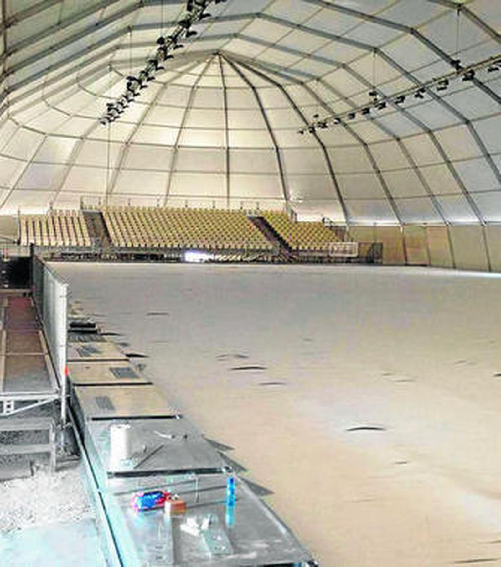 Donde se está batiendo un récord es en el Granada Iglú, el recinto que acogerá las disciplinas de patinaje artístico y de velocidad en la Universiada. Se trata de una instalación que comenzó a construirse en la explanada del Estadio Los Cármenes hace poco más de dos semanas y que ya está prácticamente equipada a nivel de gradas. Ahora mismo, las máquinas refrigeradoras están conectadas durante todo el día para crear el hielo en la pista. El mecanismo es llenar una piscina de agua y congelarla a través de las tuberías de polietileno. Al Iglú le queda todavía más de una semana, puesto que el día 19 de este mes está previsto el comienzo de su prueba test, el Campeonato de España de Patinaje.