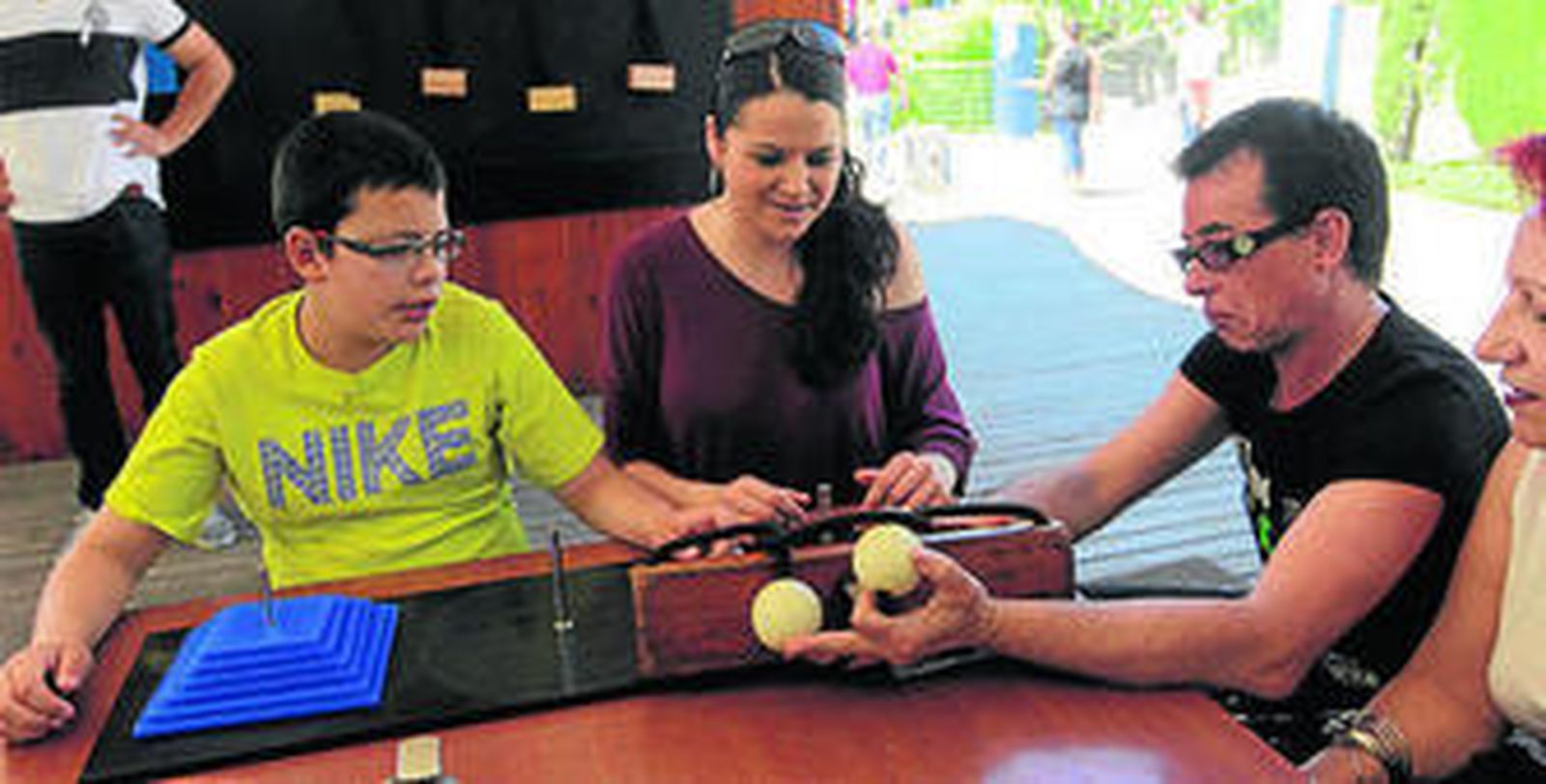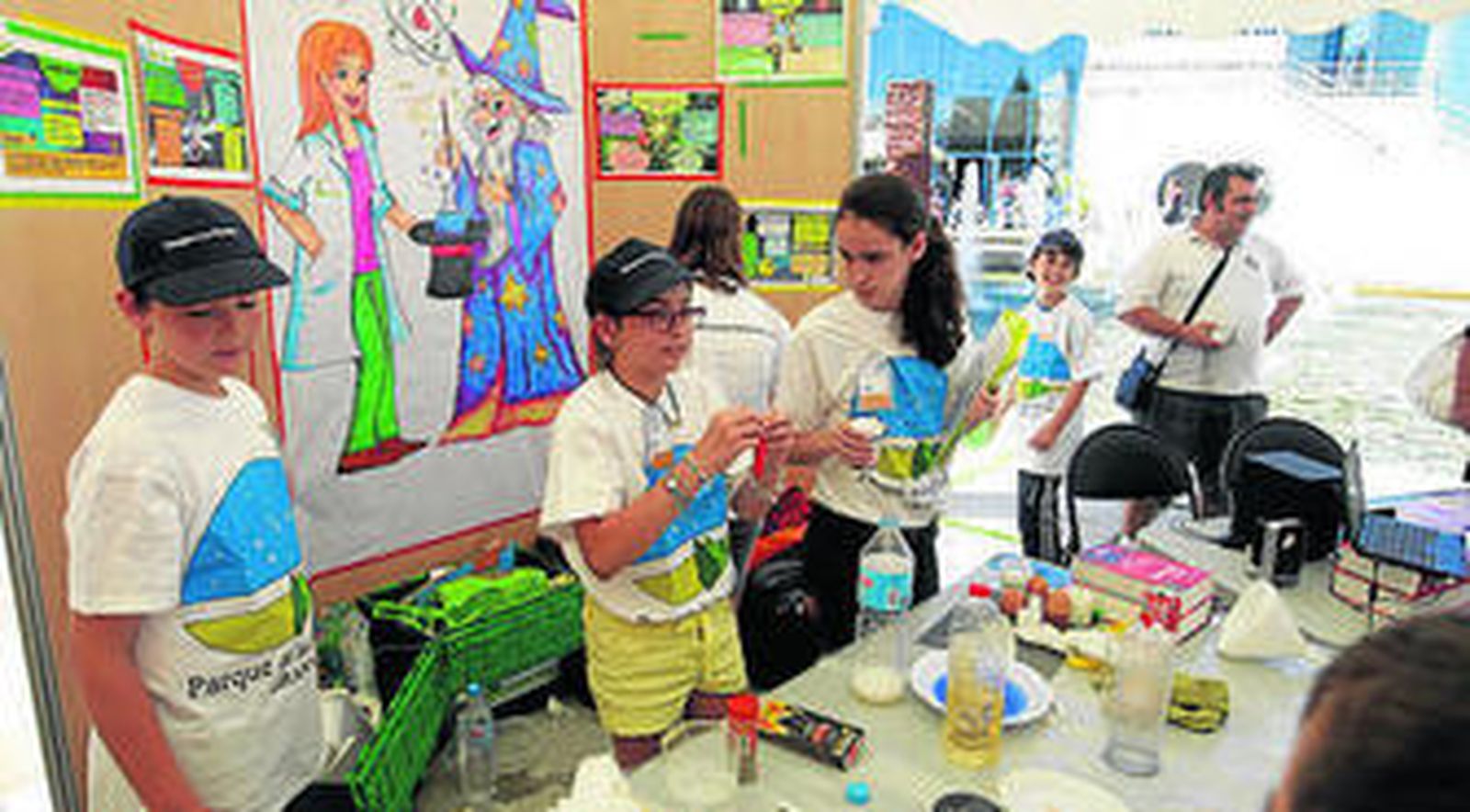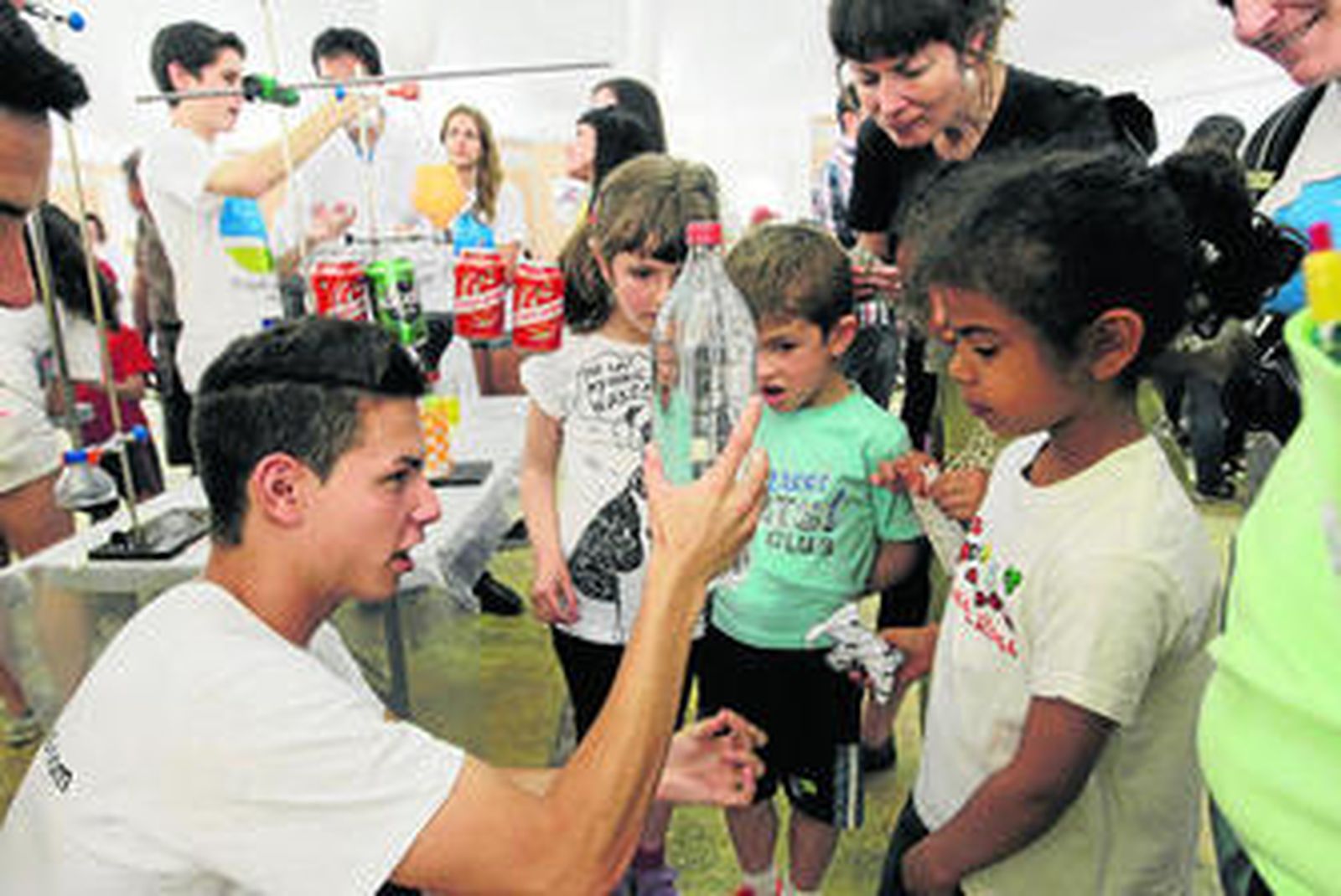 En otro de los espacios, cercano a esta terraza, numerosos jóvenes de la Feria de la Ciencia enseñaban a los visitantes curiosos experimentos, como Daniel Salazar y Juan Espinosa, que se encargaron de explicar por qué vuelan los aviones "con una pelotita de pin pong y una botella". También en esta feria, Juan David Rejón, del stand de Biobanco: "Un vehículo para que los investigadores obtengan muestras", enseñó a los viandantes la importancia de las donaciones de "tejidos o de sangre", para avanzar en las investigaciones. Aunque la verdad, los más pequeños que se acercaron hasta este stand incapaces de entender todo esto, pasaron el rato jugando con unos ratones "dóciles", de laboratorio "muy divertidos". Viaje al sistema solar, ¿Cómo medir el azúcar de la fruta?, o ¿Conexión genética?, son algunos de los sugerentes títulos con los que los participantes de esta feria acercaron la ciencia a todos los públicos.