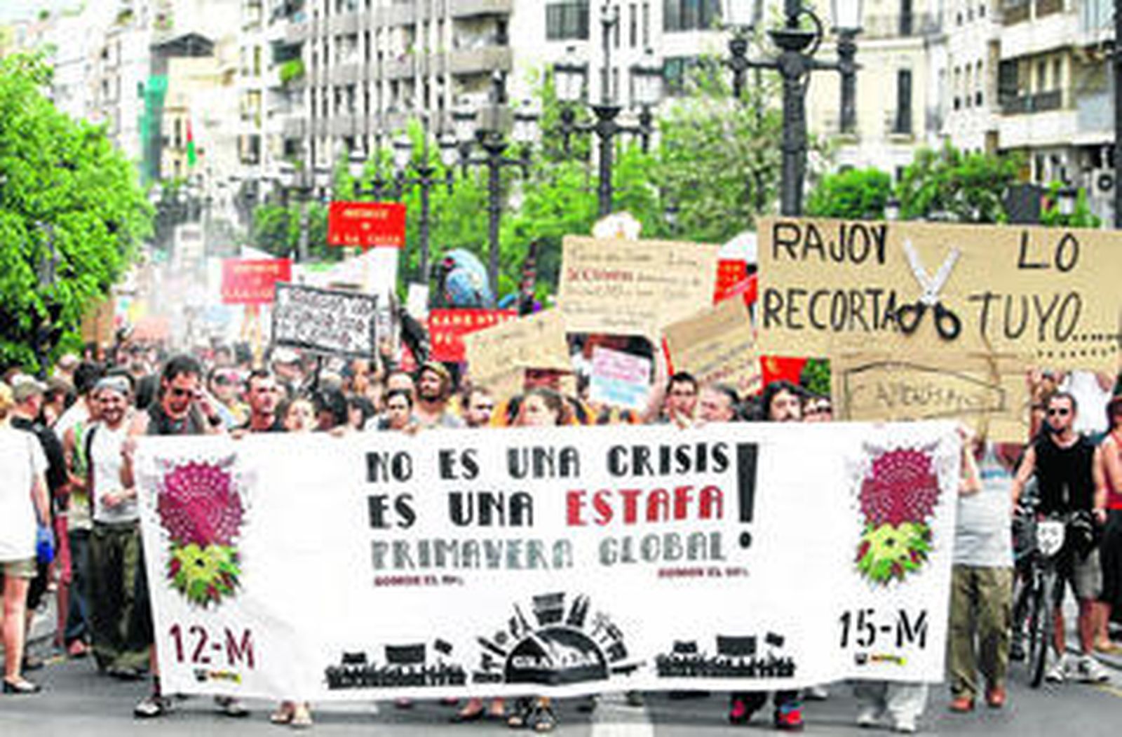 Abriendo el camino que los llevaba a la Plaza del Triunfo un gran cartel que rezazaba: "No es crisis. Es una estafa". No eran los únicos lemas que se podían ver entre las miles de caras indignadas. "Queremos educar, no emigrar"; "Privatizar, no es ahorrar"; "Si soy violenta, no soy del 15M"; "Lo llaman democracia y no lo es"; "Que recorten bancos y a políticos no derechos" y así... infinidad de mensajes con receptores directos.
