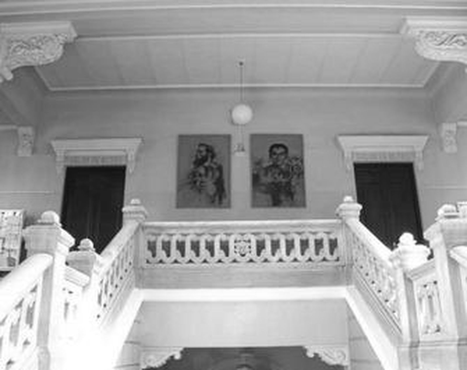 Sin embargo, y le alabo el gusto, el Instituto Padre Suárez mantiene en su segunda planta, a la que se accede por una hermosa escalera de mármol blanco y de doble derrame, el añejo y elocuente rótulo de "Salón de Actos". En el testero de la entrada nos reciben dos retratos de insignes granadinos: Ángel Ganivet y Federico García Lorca, obra del pintor granadino David Zaafra. Empezamos bien. Su interior es demasiado solemne como corresponde a un edificio de principios del siglo XX. Lo ocupan dos docenas de bancos corridos de patas torneadas bajo tres luminosas arañas de brazos dorados y adornos de cerámica vidriada. La gran sala es toda blanca, de techos altos con adornos de pilastras acanaladas con capiteles compuestos. Rompen los testeros tres grandes óculos soportados por cuernos de la abundancia de los que manan generosos racimos de uvas y simbólicas granadas.
