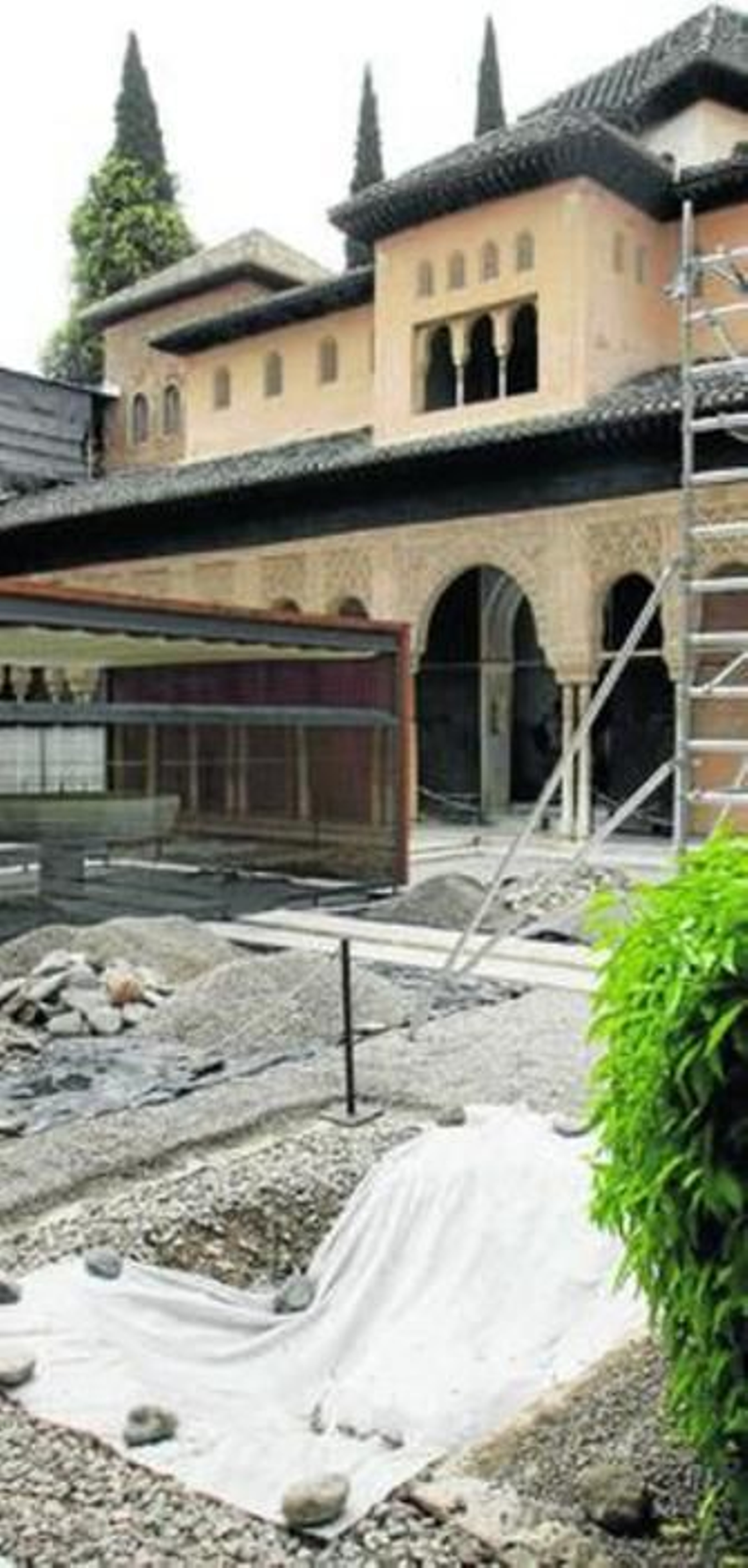 En definitiva, la vuelta de los leones está más cerca una vez comiencen los trabajos de canalización. Mientras tanto, el patio se muestra en consonancia con el resto de la ciudad con agujeros, zanjas, montículos de arena y un 'traqueteo' de máquinas taladrando el suelo que acompañó a los visitantes la semana pasada. "En la siguiente fase del proyecto se repondrá el empedrado tal y como nos ha llegado hasta ahora", concluye Francisco Lamolda, que recalca que "el agua y la arquitectura forman una unidad en el Patio de los Leones y eso es lo que tratamos de recuperar". Hasta ese momento, la Alhambra apuntala su historia.