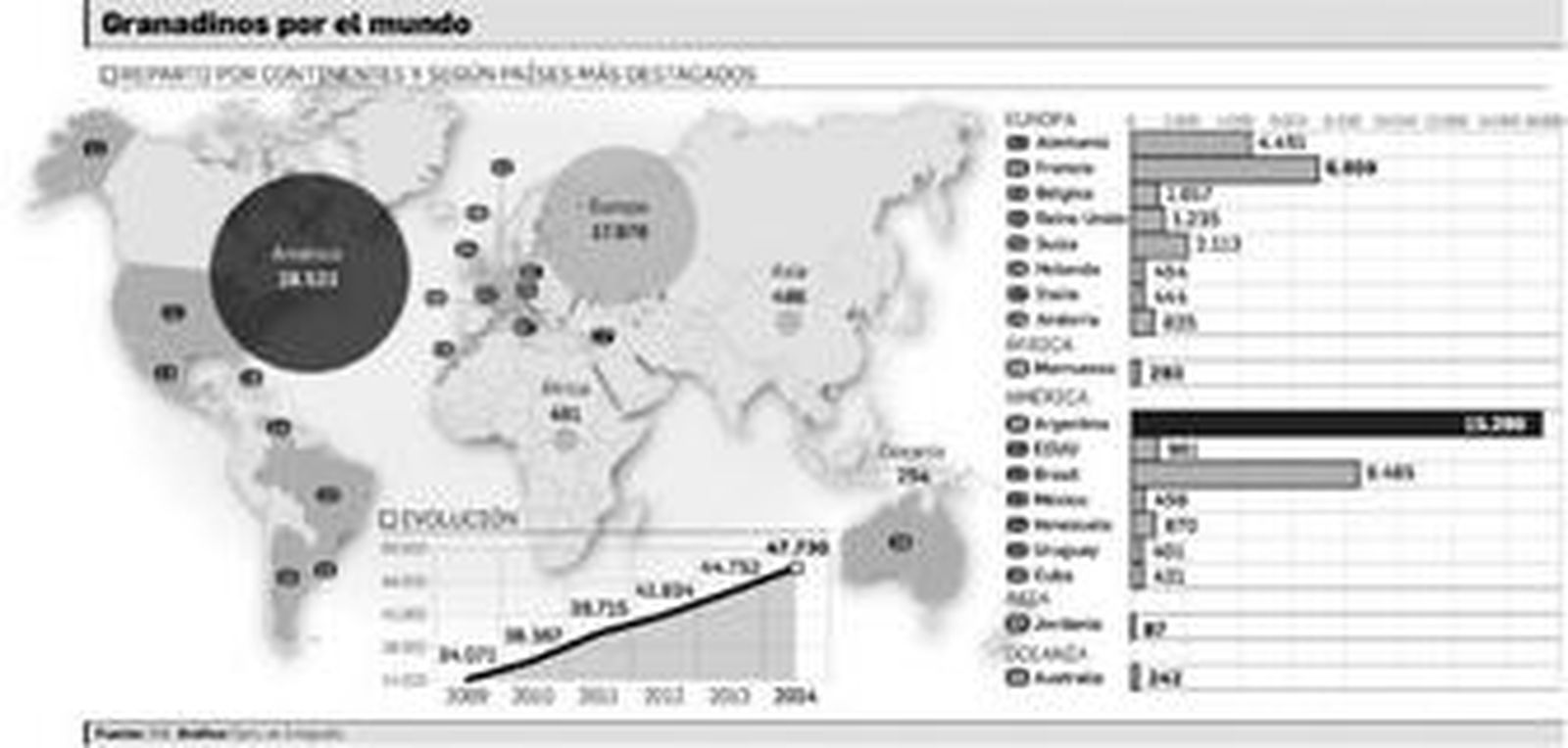 El 'pedacito' de Granada repartido por el mundo no ha hecho más que crecer desde que comenzó la crisis económica. La fuga de cerebros, la emigración forzosa de miles de jóvenes sin 'escapatoria' laboral y la vuelta a sus países de cientos de inmigrantes que llegaron en su día a Granada en busca de oportunidades que hoy han desaparecido, han multiplicado en cinco años la colonia de granadinos por el mundo. Según los datos del Padrón de Españoles Residentes en el Extranjero publicados ayer por el Instituto Nacional de Estadística (INE), un total de 47.730 granadinos viven actualmente fuera de las fronteras nacionales.