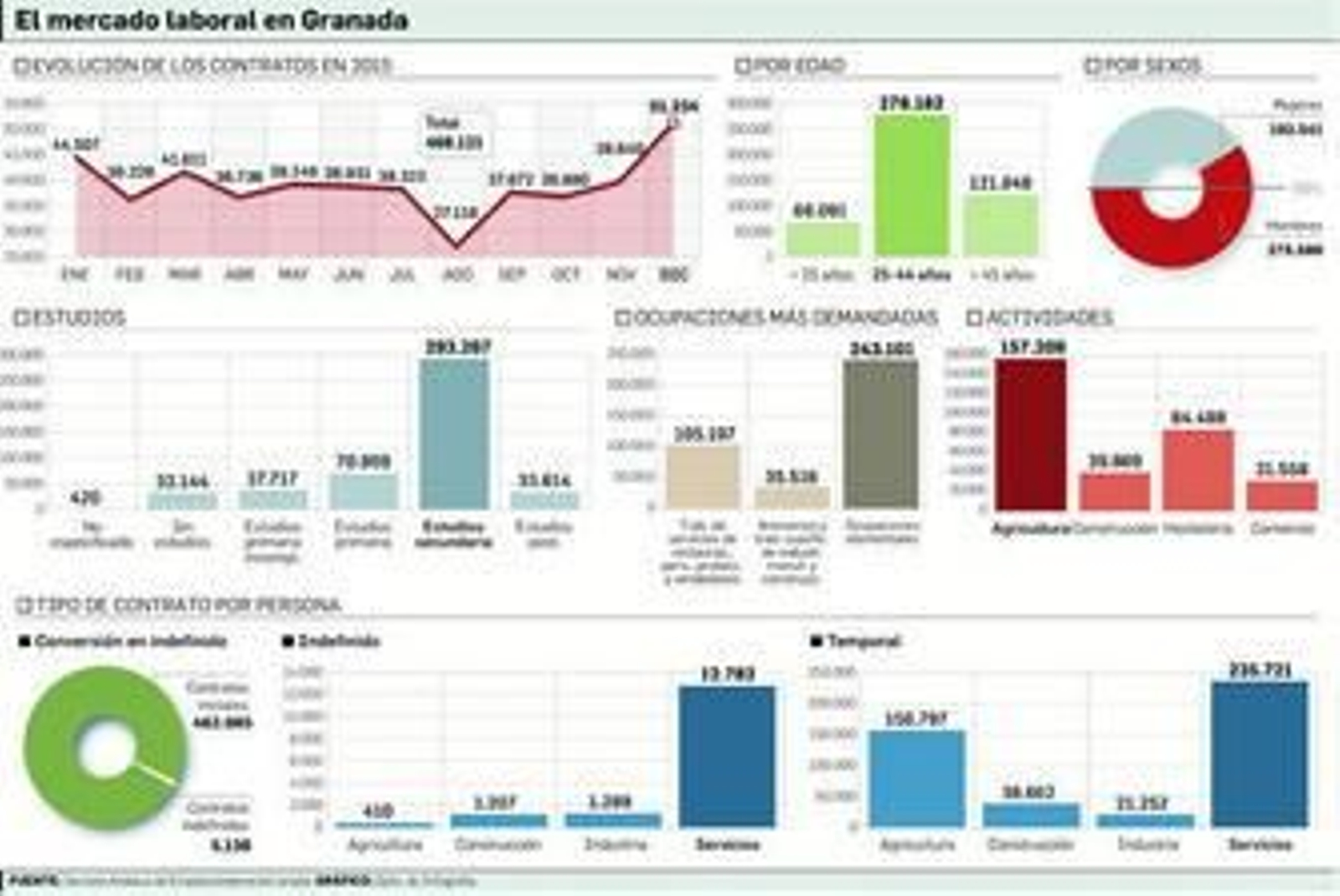 Las empresas granadinas han formalizado a lo largo de 2015 un total de 468.121 contrataciones. Nunca antes durante la crisis el mercado de trabajo granadino había registrado un movimiento tan acelerado. De hecho, ni siquiera en el año 2007, cuando la recesión todavía no formaba parte del día a día de la economía española, se registró un número tan elevado de nuevas relaciones laborales. Por aquel entonces se firmaron en la provincia 409.935 contratos, así que, con un incremento del 14,2%, parece inevitable afirmar que en 2015 se ha alcanzado una cifra récord de contratación. Pero, ¿significa esto que la situación laboral de la provincia es ahora mejor que la de hace ocho años?
