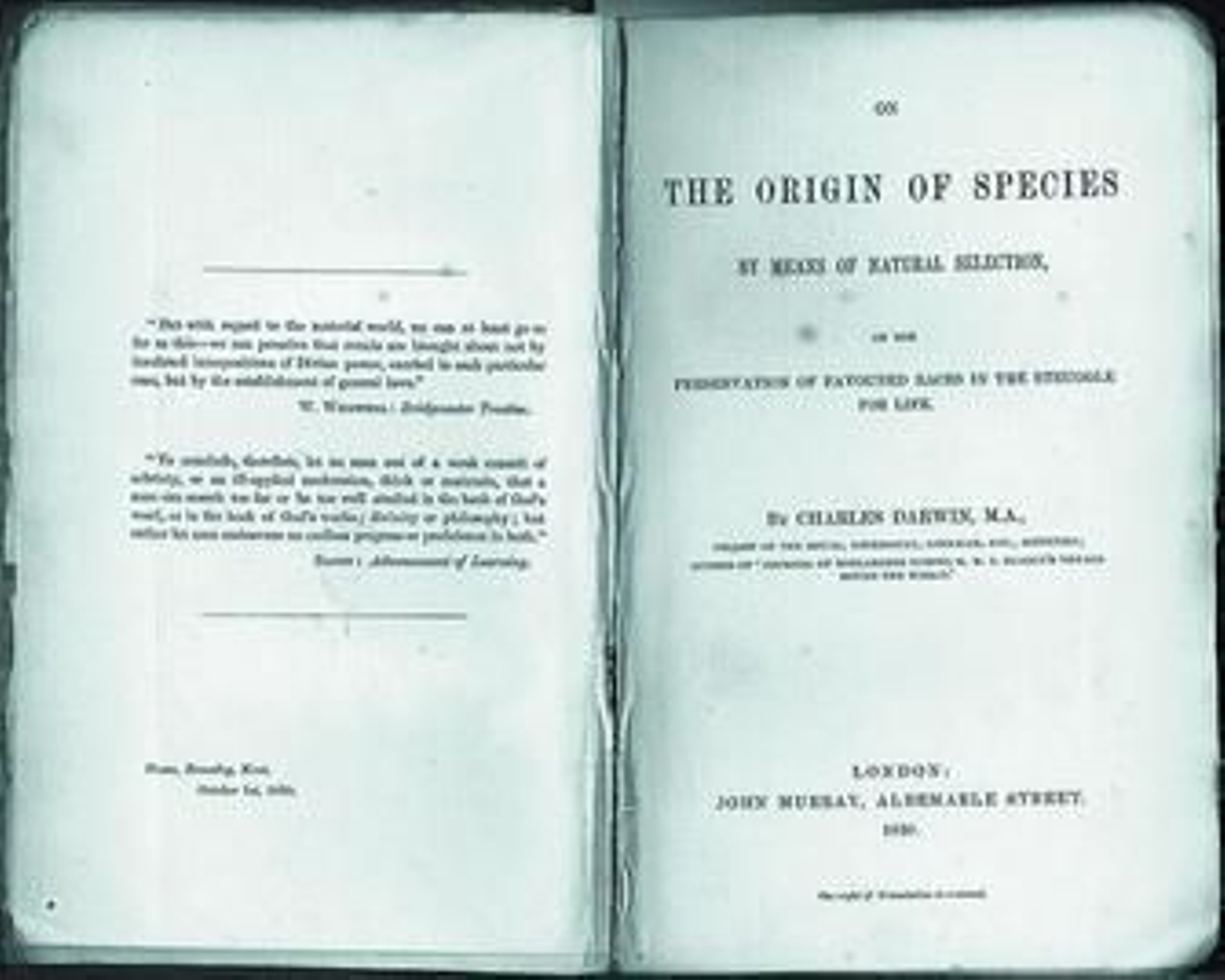 Darwin terminó de leer las pruebas de edición del libro el primer día de octubre de 1859 y recibió un ejemplar impreso el día 2 de noviembre; en la segunda semana de ese mes se enviaron ejemplares de presentación y para el 20 de noviembre las peticiones de los libreros al editor de Darwin, John Murray, ya superaban el número de libros que constituían esa primera edición que era de 1250 ejemplares. En definitiva para el 22 de noviembre la edición ya estaba vendida al completo incluso antes de la fecha oficial de publicación. La segunda edición de tres mil ejemplares, impresa poco después, obtuvo igual éxito. Recordemos que se trataba, se trata, de un texto de unas 650 páginas y con un título tan farragoso como On the Origin of Species by means of Natural Selectión, or the Preservation of Favoured Races in the Struggle for Life, es decir en su traducción española "Del origen de las especies por medio de la selección natural o la conservación de las razas favorecidas en la lucha por la vida".