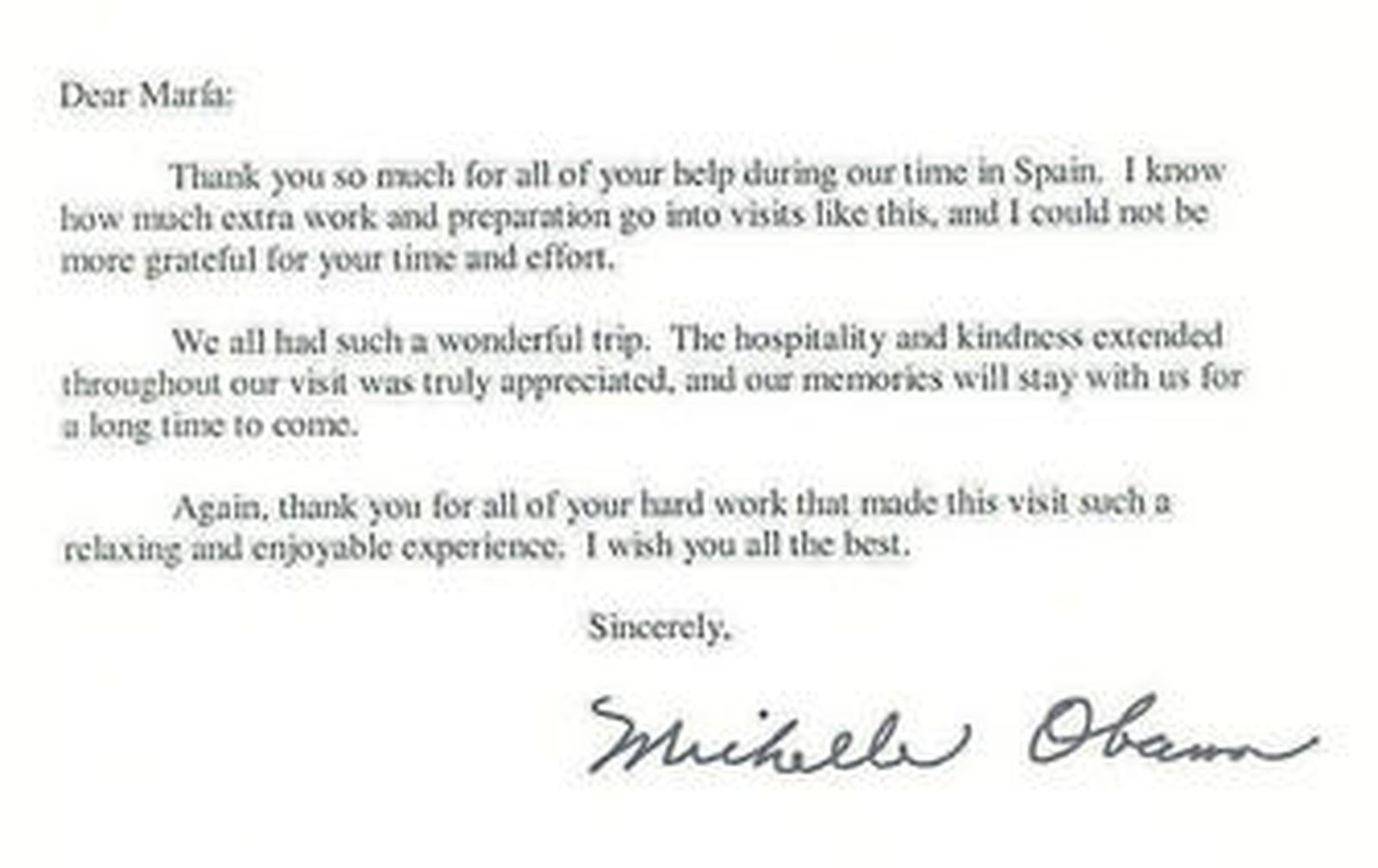 En la carta remitida a la directora del Patronato, María del Mar Villafranca, Obama agradece la atención recibida durante la "inolvidable" visita de unas horas que realizó al monumento nazarí el 5 de agosto. La primera dama, además, agradece la "hospitalidad y amabilidad" recibida y el trabajo y esfuerzo que conllevaron los preparativos para una visita de este tipo.