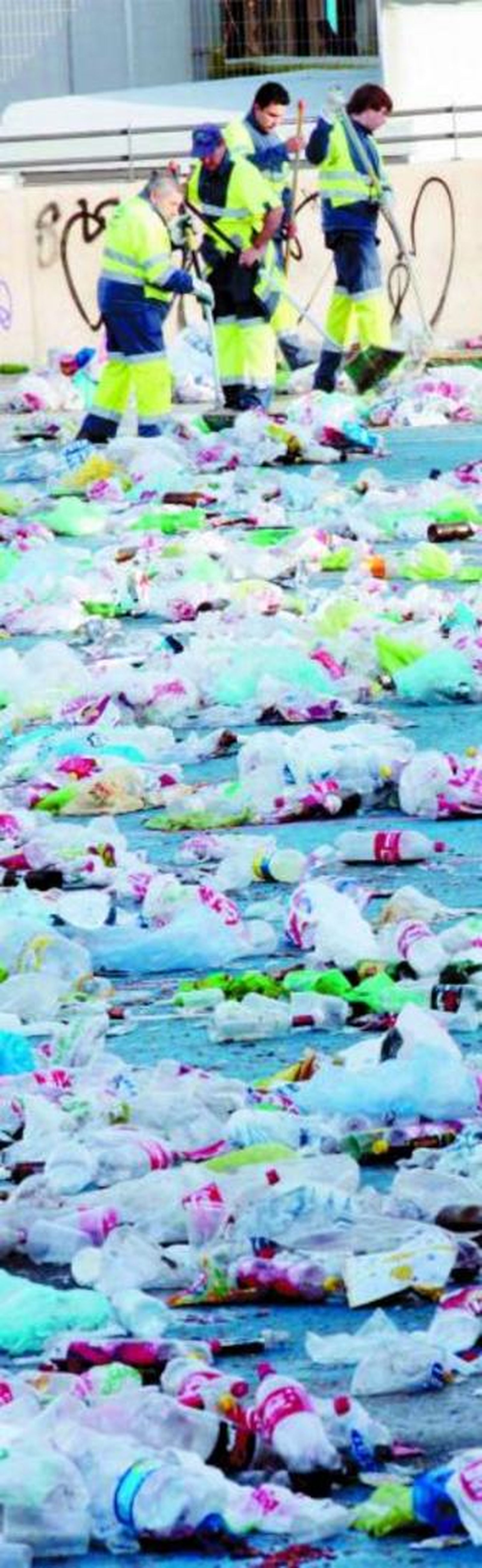 Asimismo, Inagra -la empresa concesionaria del servicio de limpieza de Granada- tuvo que emplear a 50 de sus operarios (así como 3 camiones de recogida, 3 barredoras, 3 baldeadoras, 2 baldeadoras peatonales y 5 mangas de riego) para retirar las 25 toneladas de residuos orgánicos y las 20 de plásticos y botellas que generaron los 15.000 jóvenes asistentes al macrobotellón. Este dispositivo especial de limpieza, que desarrolló su cometido en el botellódromo desde las 05.00 a las 10.00 horas de ayer, costará al municipio otros 9.000 euros, según los cálculos de la Concejalía de Mantenimiento de Granada.