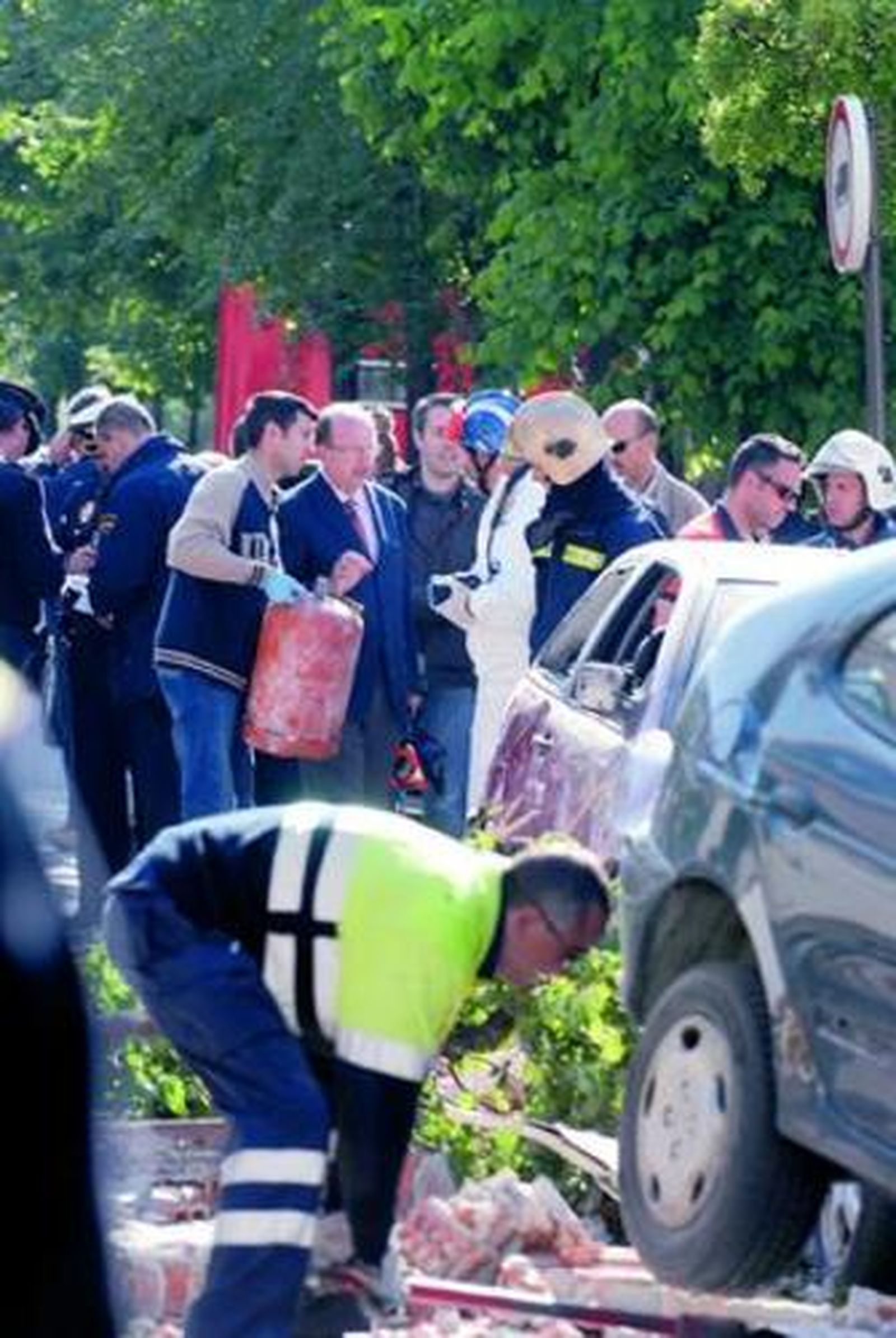 Todos los efectivos del Parque Norte de Bomberos, con el jefe del cuerpo, Manuel Salas, a la cabeza, se desplazaron hasta Cardenal Parrado. Junto a ellos, agentes de la Policía Nacional y Local, varias ambulancias del 061, junto a personal de Protección Civil y del 112. Los policías acordonaron la zona mientras los bomberos accedían al inmueble afectado. El jefe de bomberos informó de que la explosión se había producido por "probablemente por un despiste del técnico del gas" que trabajaba en la instalación de la cocina. "Cualquier cosa, el frigorífico o una chispa pudo haber provocado la explosión" después de que la habitación se llenase del suficiente gas para provocar la detonación. Los bomberos fueron los que sacaron del edificio al único fallecido en los hechos, un hombre de 51 años que, junto a su hija de 27, estaba en el apartamento contiguo al que se produjo la explosión. Salas explicó que "el cuerpo se ha encontrado justo en la esquina de una habitación. La onda expansiva lo ha empotrado contra la pared". Y allí encontraron el cadáver los bomberos, "acurrucado y con la cabeza en las manos".