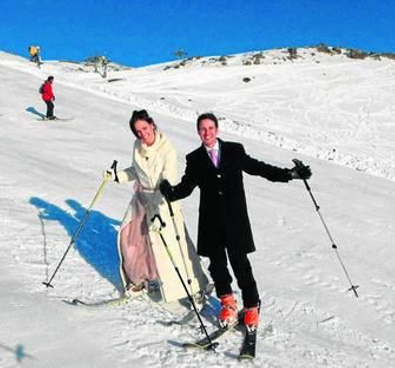 Acompañados por un cortejo nupcial de unos treinta amigos y familiares -en el que no había ni pamelas ni chaqués, sino monos, cascos, gafas y guantes de esquí-, los felicísimos novios bajaron esquiando hasta el mismo hotel, donde el personal los esperaba para dar comienzo al banquete de esta boda de altura.