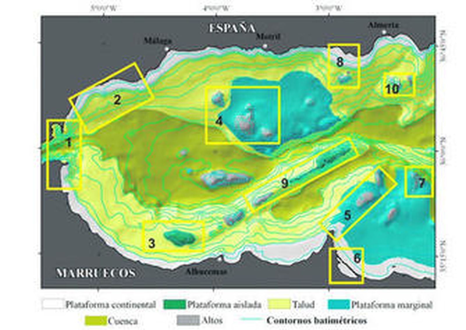 Otro lugar singular del Mediterráneo occidental es el monte Djibouti, que se sitúa a unos 60 kilómetros de la Costa, frente a la localidad de La Herradura y tiene una superficie de 165 kilómetros cuadrados.