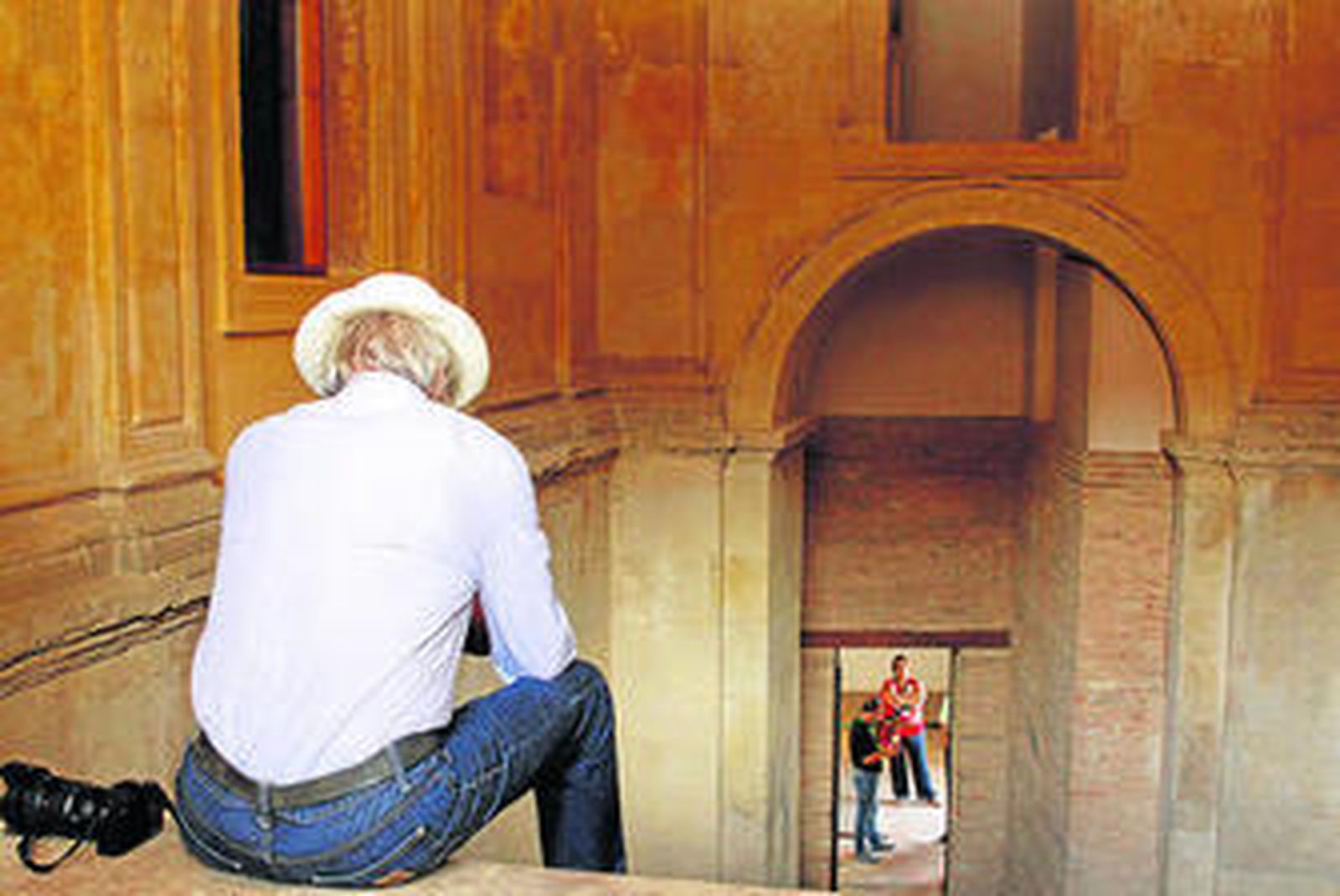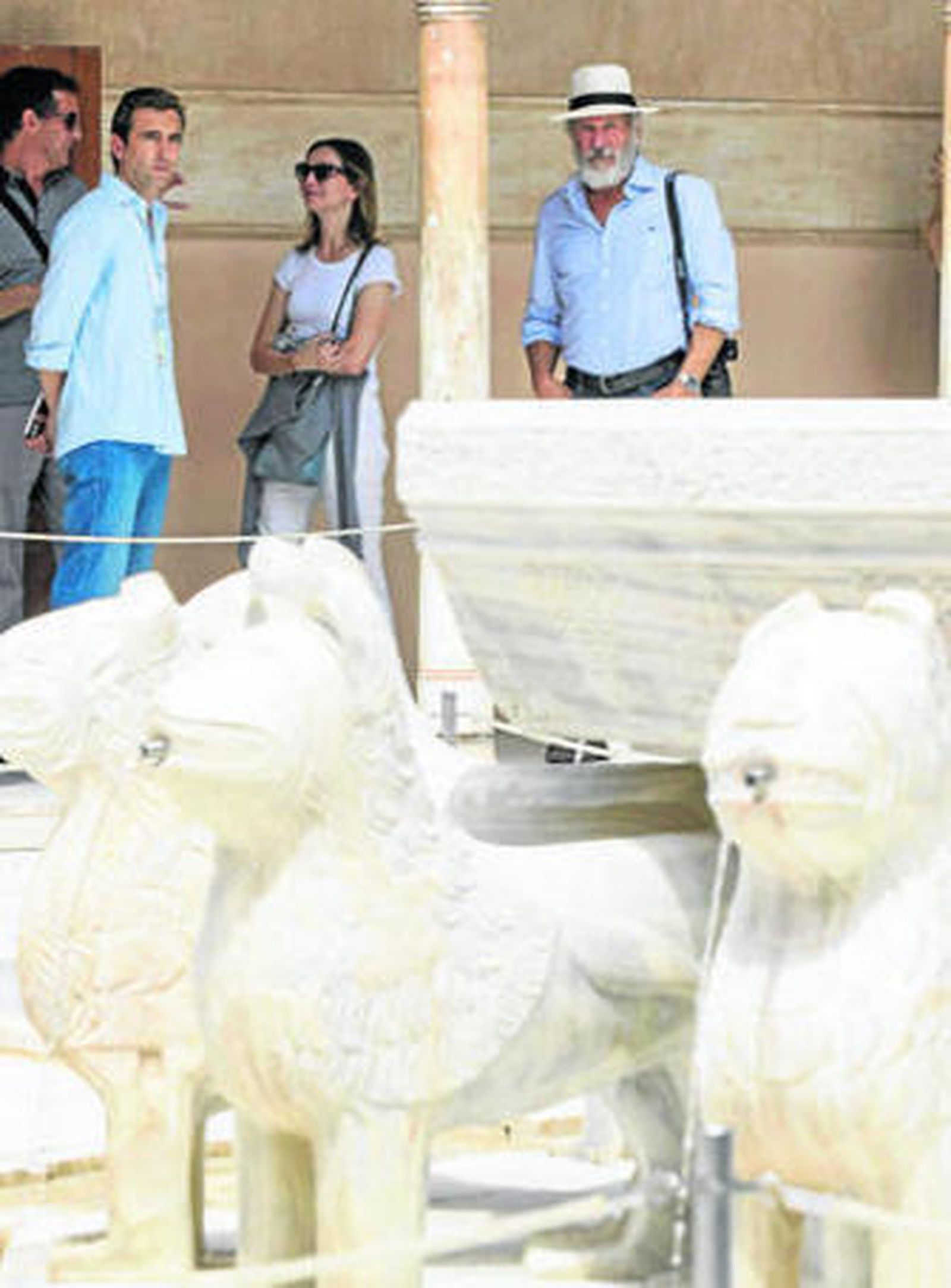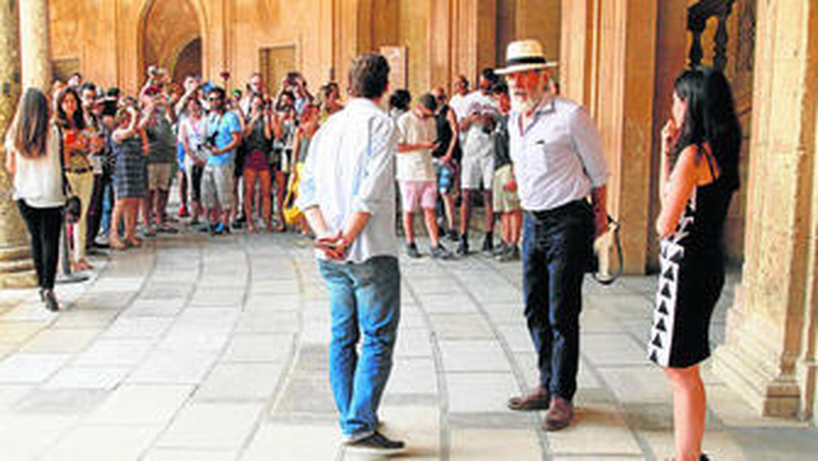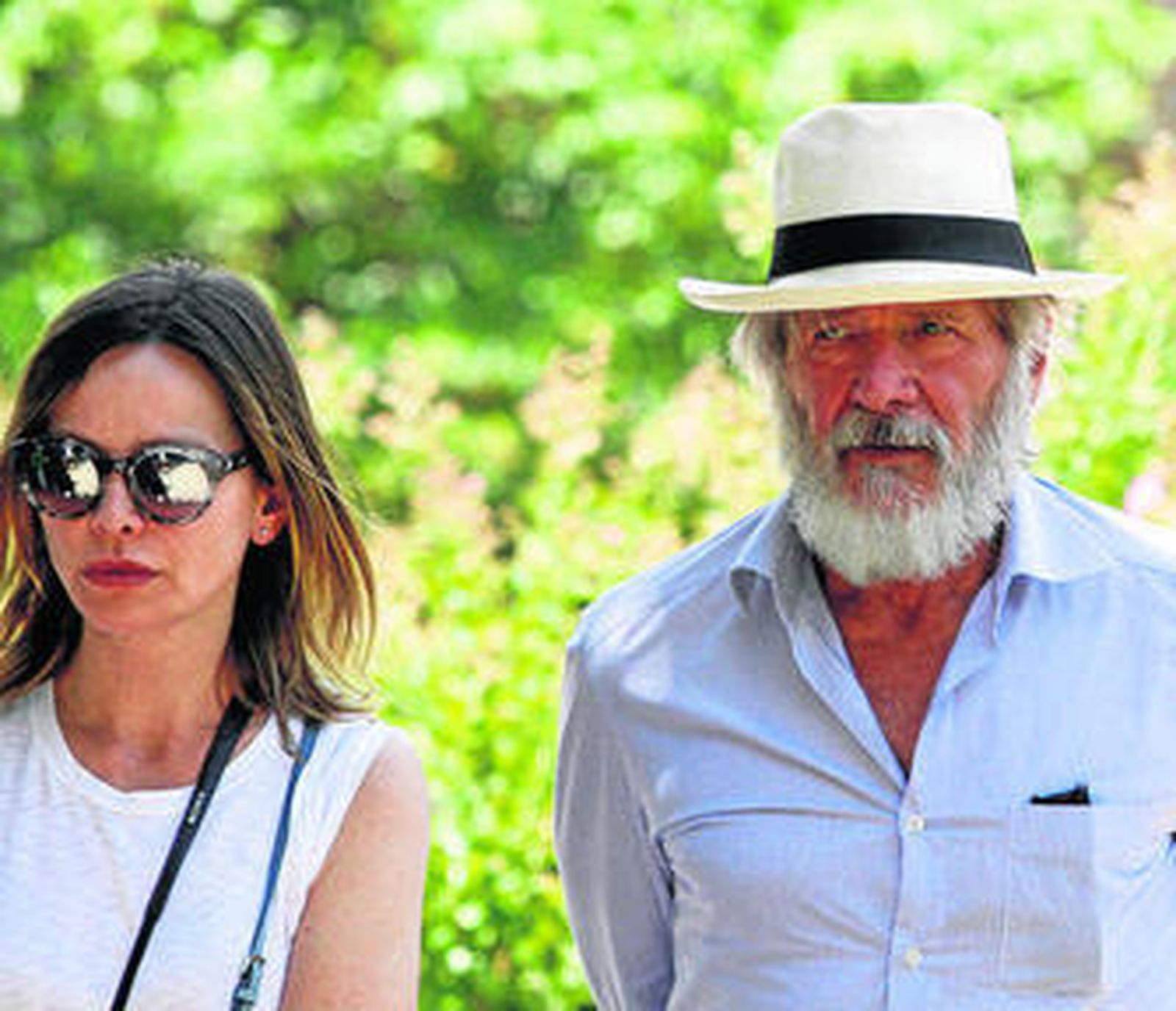 Han Solo estuvo ayer paseando por la Alhambra, aunque disfrazado de El Fugitivo con una poblada barba blanca y un pelo canoso que se le desparrama por las sienes. Harrison Ford llegó al monumento nazarí a las tres de la tarde, con ese aire huidizo y de cierto despiste con el que ha conquistado en la pantalla a millones de espectadoras y, de paso, a Calista Flockhart, la actriz de Ally McBeal, que en cuanto atisbó la nube de cámaras que esperaba a la pareja a la entrada del Carlos V se esfumó de la escena. Con pantalones vaqueros Carhartt, camisa a rayas blancas y azules, pendiente y un sombrero panamá blanco, el protagonista de la saga Indiana Jones formó todo un revuelo entre los pocos visitantes que a esas horas no se esperaban, ni de lejos, toparse con el Rick Deckard de Blade Runner. A diferencia de su visita a la Catedral de Córdoba, cuando fue literalmente asediado por una nube de fans enfervorizados móvil en ristre, el actor pudo llegar al Carlos V sin tener que parar para hacerse una fotografía. Eso sí, cuando subió las escalinatas, se volvió y cogió su cámara Sony apuntando a todos los que en ese momento hubiesen dado una mano por hacerse un selfie con el actor; como cuando en Indiana Jones y el arca perdida se topa con un tipo de dos metros blandiendo una colosal cimitarra y, sin inmutarse, le descecarraja un tiro.