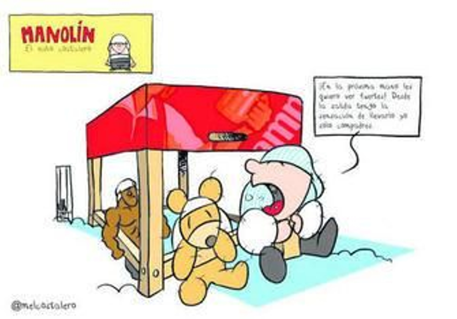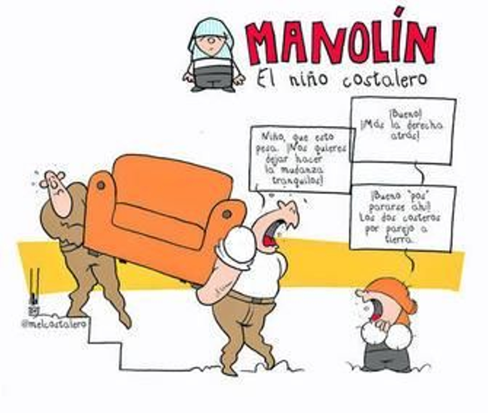 Las andanzas del niño que, en lugar de una camiseta de la Selección de fútbol, lleva siempre un costal sobre la cabeza, se pueden adquirir en Libros.com. y ya hay en internet un episodio piloto de lo que sería una serie de animación con Manolín como protagonista, además de contar con diferentes artículos de merchandising como camisetas, tazas o pulseras. Con gran inspiración en personajes como la mítica Mafalda, Vicen ha sumado sus experiencias como costalero junto a las aportaciones de su hijo Diego de cinco años. "Me inspiro en cosas cotidianas que he vivido con las que todos los cofrades se sentirán identificados", detalla el escritor sobre un proyecto que podría incluso dar el salto a las tablas del teatro. Vicen, que compagina los rotuladores con su profesión de actor en la compañía Spasmo Teatro, ya ha recibido alguna propuesta de compañeros de profesión para que Manolín sea el protagonista de una obra que sería una especie de "musical cofrade". Y es que el pequeño personaje ya es un habitual de los grupos de chat de whatsap de las cuadrillas. "Estoy recibiendo peticiones de todas partes para las aventuras", asegura Vicen sobre un personaje real como la Semana Santa misma. Sólo hay que darse una vuelta por la ciudad cuando salen los pasos para ver cuadrillas improvisadas de niños que llevan cuatro palos sobre los hombros, pero no renuncian a dar su chicotá. "Este finde mi padre me ha llevado a la Warner", le dice un niño a Manolín en una de las viñetas. "Pues el mío me ha llevado a San Lorenzo a ver la Divina Pastora, al Rosario de Consolación y me ha comprado dos sobres de la liga. No digo que el tuyo no te quiera, pero el mío me quiere tela para aguantar todo eso", le replica el niño cofrade que, claro, cuando sus padres se mudan, dirige con precisión a los dos obreros que cargan con el sofá.