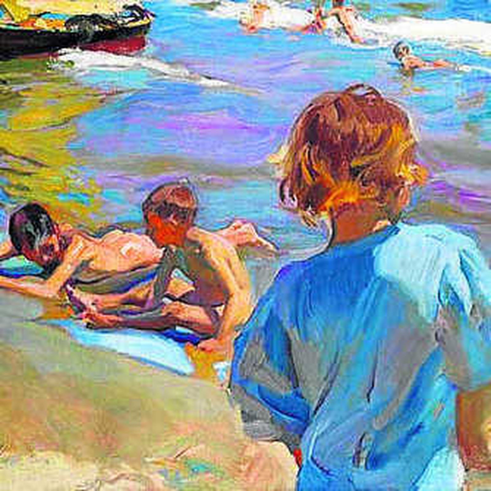 Desde una perspectiva complicada, el pintor retrata en primer plano a un niño que observa junto a la orilla cómo otros dos menores juegan tumbados en la arena, uno de ellos en una posición especialmente difícil de conseguir.