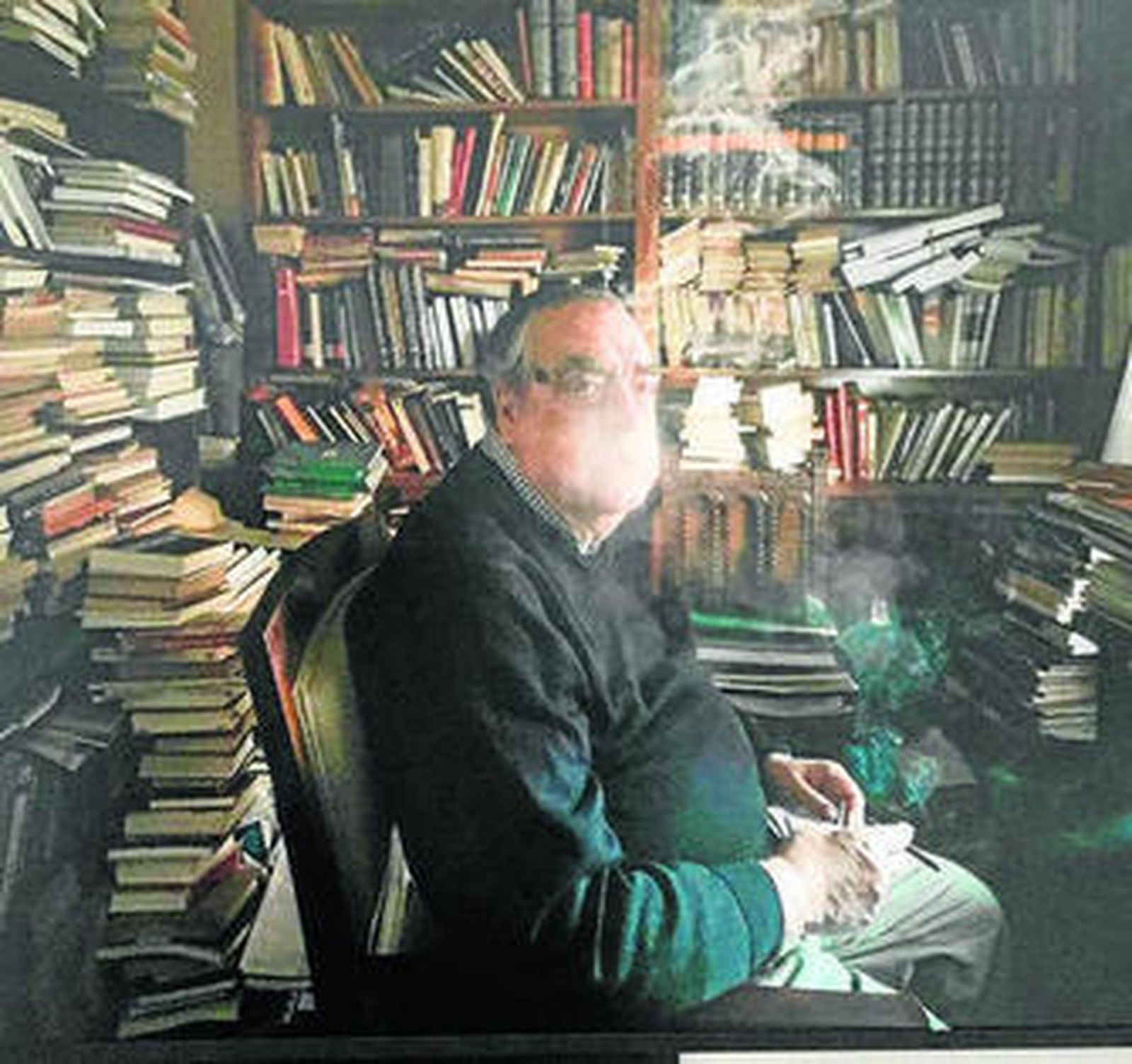 Escritores rodeados de libros en sus bibliotecas, como Julio Manuel de la Rosa (Sevilla, 1935), autor de No estamos solos, entre otros títulos.