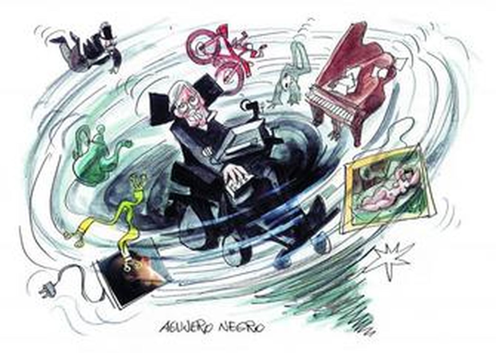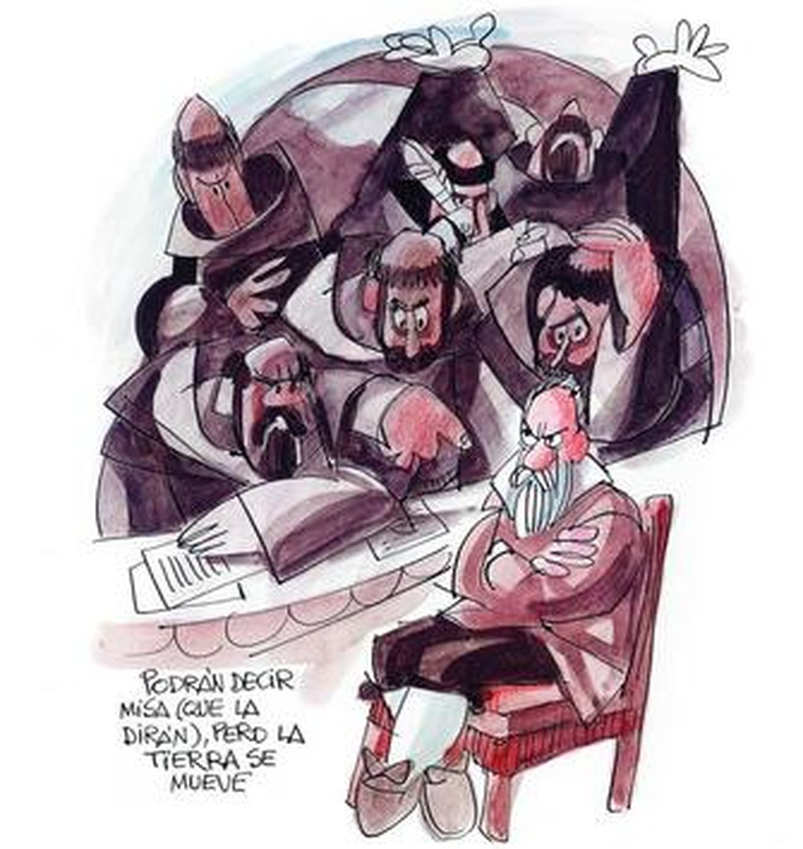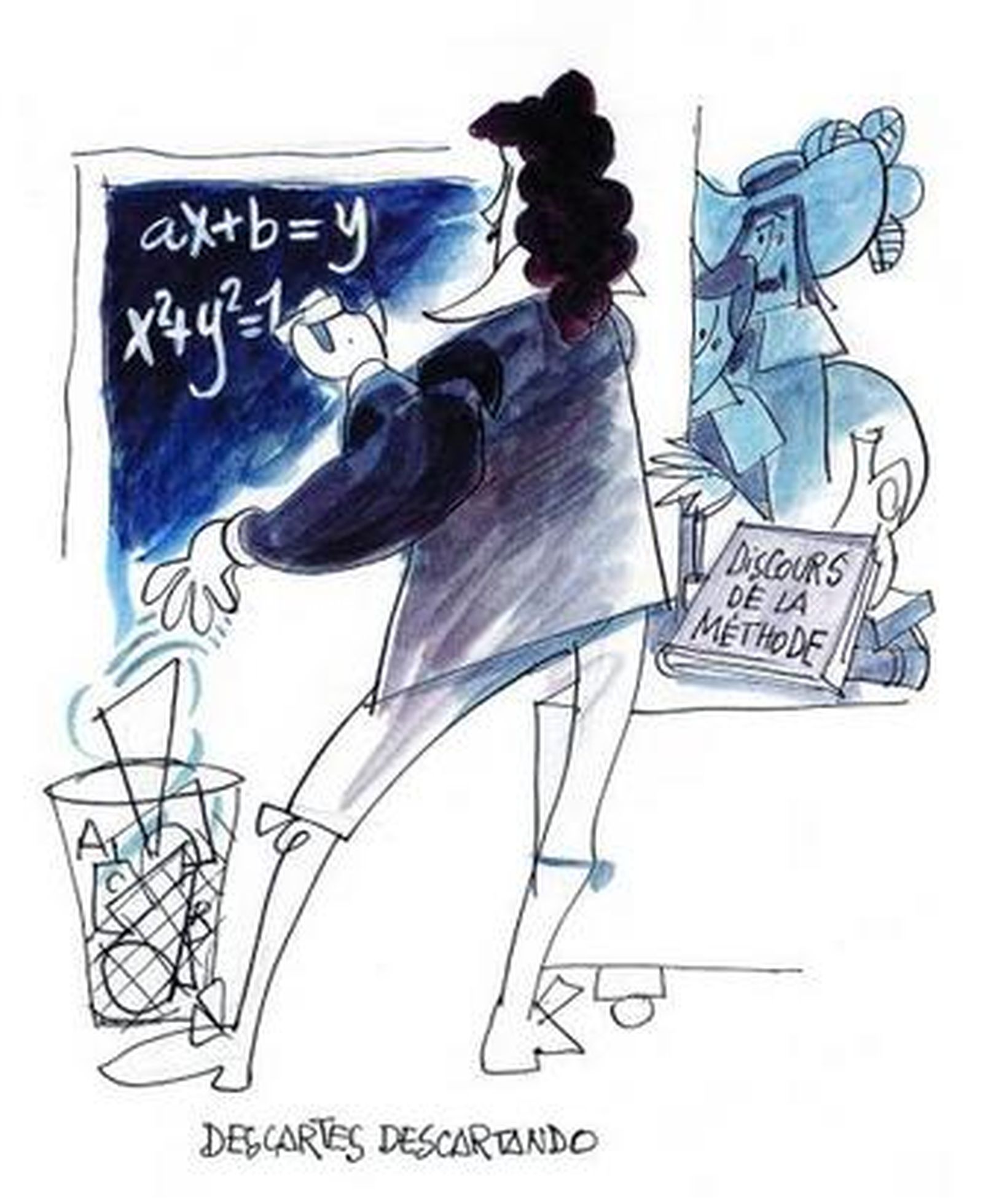Mingote los dibuja solos o en su contexto. Así, Galileo aparece en 'actitud seria', en medio de planetas y estrellas a los que mira con un telescopio o enfrentándose a la Inquisición en una actitud testaruda, incansable y firme frente al temido tribunal. Aparecen Descartes descartando valiéndose de una papelera, Newton y Leibniz hablando de sus cosas rodeados de fórmulas o el popular físico británico Stephen Hawking sumido en un muy particular agujero negro capaz de tragar pianos, bicicletas, tirantes o majas desnudas.