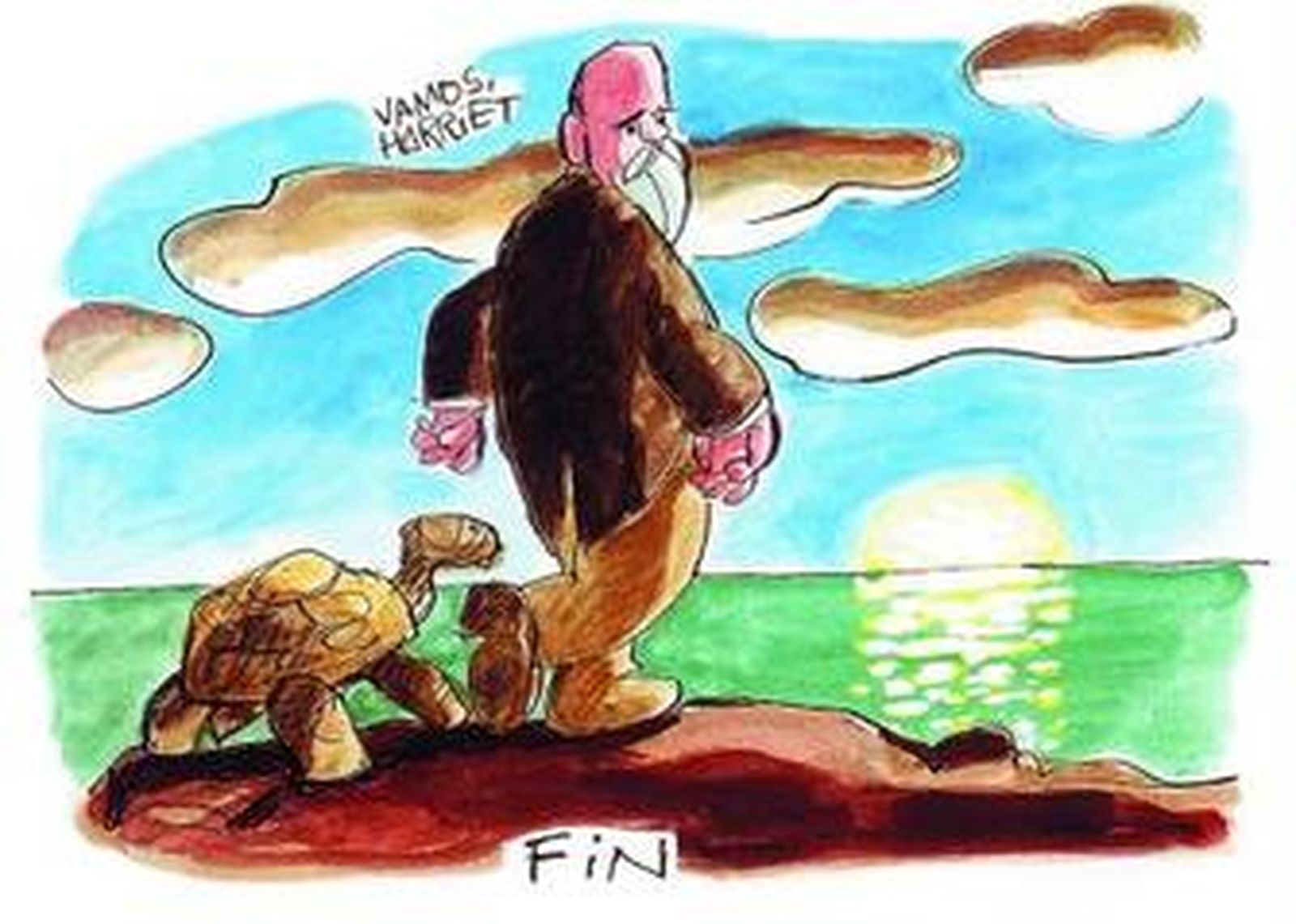 El último de los dibujos de Mingote, con el que se cierra el libro, tiene como protagonista a la tortuga Harriet, el animal más viejo del mundo (murió con 176 años) y que supuestamente fue uno de los ejemplares que examinó Darwin en 1835.