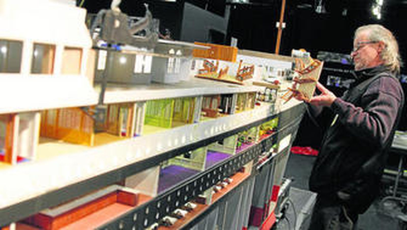 Es una sala con un orden desordenado, aunque hay detalles que delatan una de las pasiones de Enric Calvo; las colas y las pinturas están en botes de comida para animales que el diseñador de la maqueta se ha traído de casa después de dar a comer a sus perros. El ambiente es de una falsa calma, distendido pero muy profesional, con música comercial de fondo atemperando los rítmicos golpes de martillo o el repicar del taladro.