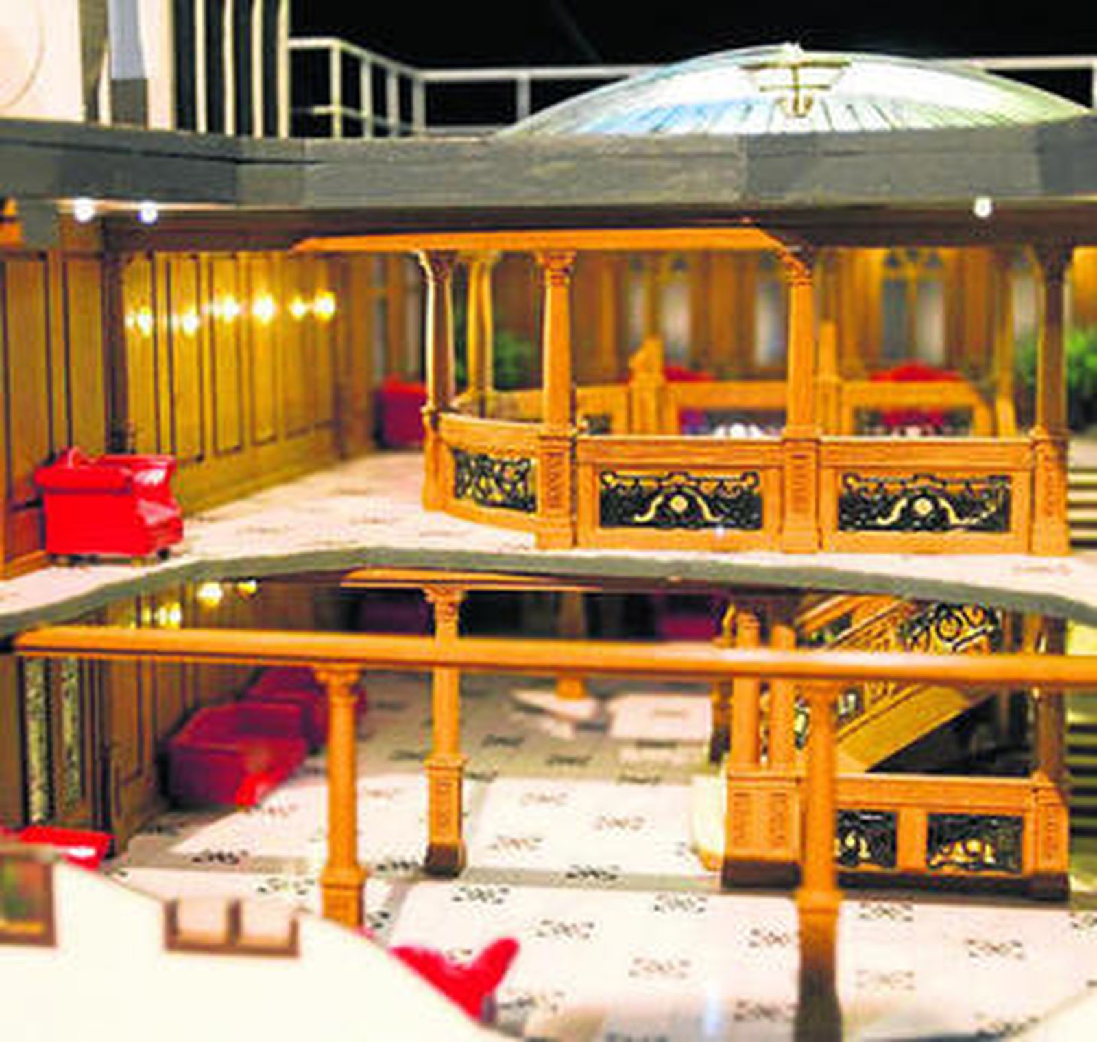 La majestuosa reproducción, que ocupa 12 metros de largo, 4,5 metros de ancho y 3 metros de alto, ha sido elaborada con piezas fabricadas y pintadas a mano por un equipo liderado por el maquetista catalán Enric Calvo. Tampoco falta la maqueta a escala del muelle de donde zarpó, con sus espigadas grúas, su tren repleto de carbón y un bullicio inerte. El paquebote consta de una estructura metálica interna ligera y flexible, sobre la que se han articulando los recubrimientos de maderas de distintos tipos, así como resinas, poliuretanos, plásticos y metal. Y no falta ni un detalle, hasta se pueden contar los platos que hay en la cocina, recrearse en la reproducción de la piscina o del baño turco del buque. También se puede recorrer con la vista la famosa escalinata con su espectacular cúpula, famosa por la película de James Cameron que dejó a todos los espectadores la misma pregunta: ¿Por qué Kate Winslet no le hace un hueco en su madero a Leonardo DiCaprio?