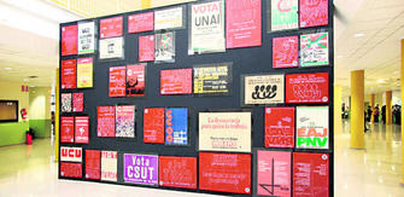 El artista navarro, profesor de nuestra Facultad de Bellas Artes, se vale de aquellos carteles que guardó de adolescente, y compone un entramado con las imágenes de los mismos y unas copias realizadas en madera pintada de rojo, sobre las que ha dibujado con cera blanca -que imita la apariencia de la tiza-. La visión de una misma imagen repetida y simétrica potencia su efecto y capta la atención. Es lo que ocurre en el aluvión de una campaña electoral, repetición incesante de lo mismo hasta convertir la realidad en un medio mediato que ha roto el hilo argumental de una existencia con pocas alteraciones. Además la instalación -un muro de siete por cinco metros- se ha efectuado conscientemente en el propio Campus universitario, un escenario habitualmente poblado de mensaje que pretenden captar una atención y que sintoniza con la idea originaria. Aquí amplía, a conciencia, el aspecto textual en detrimento de lo visual. Muy bien ideado y mejor planteado este proyecto del profesor Osakar que nos conduce por una realidad artística diferente en la que intervienen muchos aspectos que abren las perspectivas artísticas y sintonizan con un nuevo concepto que funden intereses muy diversos.