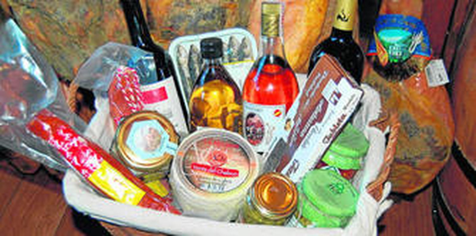 La provincia de Granada tiene la suerte de poseer un gran abanico de productos con los que confeccionar un atractivo regalo que llenará de alegría a sus beneficiarios. En toda cesta que se precie no debe faltar un jamón alpujarreño, que dependiendo del presupuesto podrá corresponder a 12, 14 o 18 meses de curación. Para que luzca, se deberá atar la pata en la mitad del arco de la cesta que permita ver la maza.